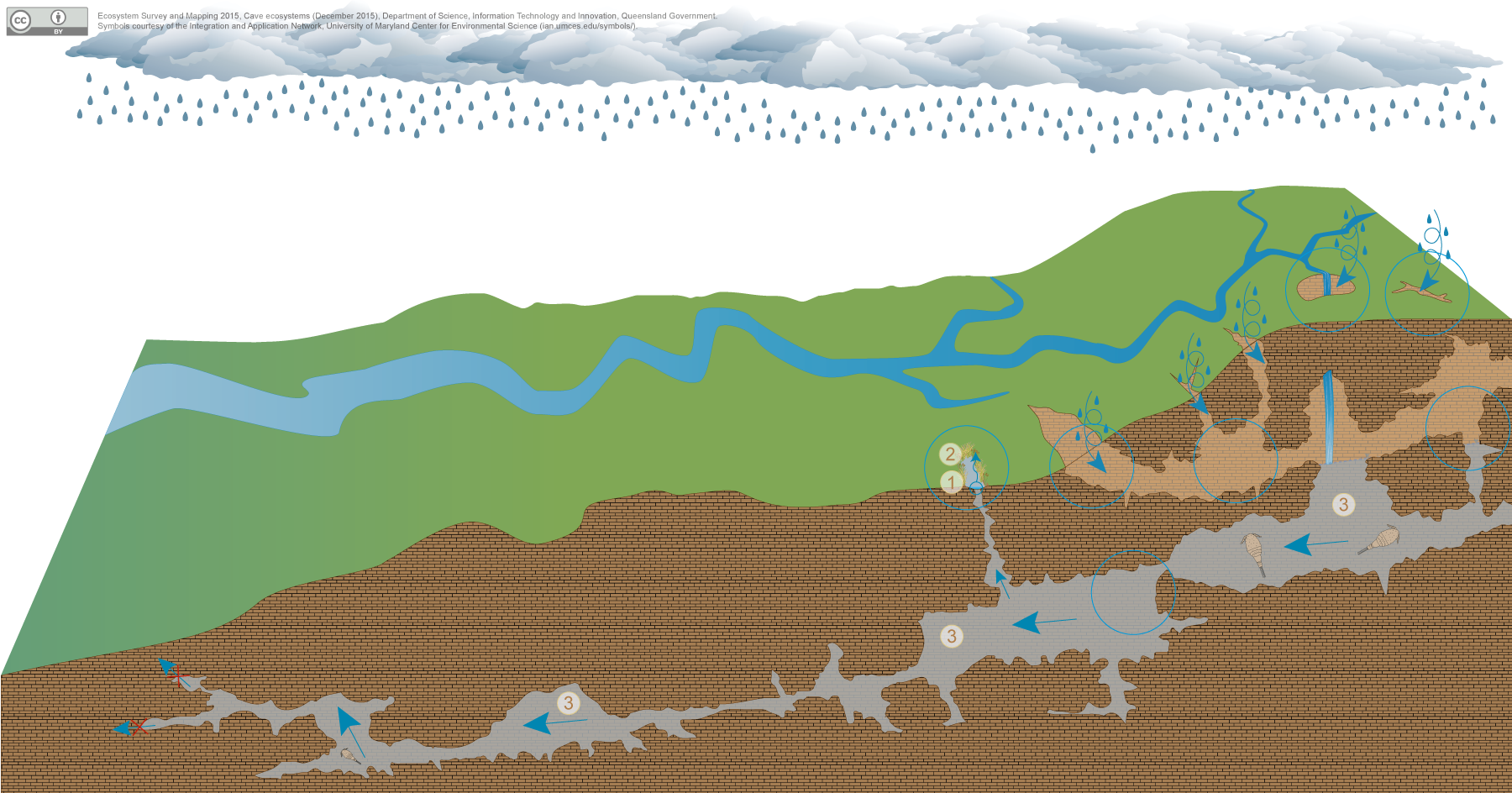 Click on elements of the model or select from the tabs below Subterranean wetlands include all underground areas containing water, including caves and aquifers. Subterranean cave systems are groundwater dependent ecosystems. Subterranean cave systems with large void sizes are part of ‘karst landscapes’ often characterised by sinkholes and springs. Karst landscapes are commonly found in regions where carbonate rocks are abundant. Carbonate rock may be fractured and/or dissolved by mechanical weathering and chemical weathering from contract with water (e.g. rain and soil water naturally containing weak acids). Subterranean cave ecosystems can be divided into four zones (shown as focal circles in the conceptual model):