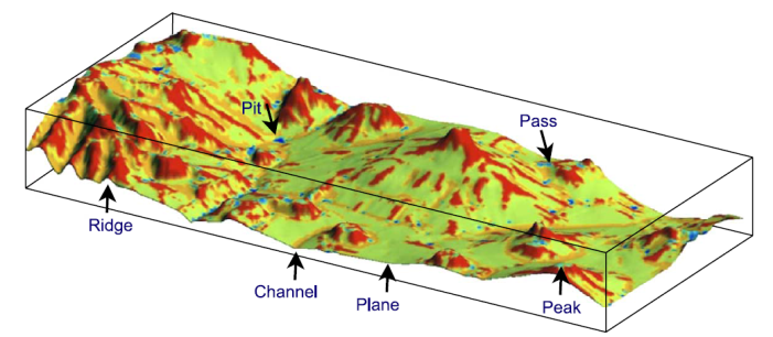 Benthic terrain morphologyBenthic terrain morphology is defined as the shape of the sea floor, analogous to the basic shapes that are measured through the process of marine geomorphometry[12]. Other definitions may include a number of other physical substrate attributes in their definition of morphology (e.g. shape, size, texture, various spatial attributes such as sinuosity etc.)[7]. Morphology is one of several attributes contributing to geomorphological descriptors in a terrain typology. Terrain morphs (such as a plane) can also be classified into a typology incorporating the slope attribute e.g. gently sloping plane, steeply sloping plane etc. Terrain morphology defines the basic three-dimensional shapes that underpin the features of the intertidal area and sea floor. These shapes are recognizable at a range of scales (levels) from the regional (e.g. continental shelf, slope and abyss) through to habitat (e.g. beach ridges, intertidal channels, gutters, holes) and community levels (e.g. rock pools). Morphology of the sea floor directly influences water column energy and subsequent geomorphological (e.g. transport & depositional) processes[1][15][16][17]. The shape of the sea floor and intertidal area interacts with tidal, current and wave energy, creating eddies and currents that swirl above sea floor peaks and upwellings that interact with the continental shelf and slope. Morphological features (including the underlying matrices formed by dead organisms – see substrate composition and substrate consolidation attributes) can provide the structural complexity that creates many microhabitat types and increases diversity and abundance[8][6]. Typically peaks and crests on the sea floor are associated with consolidated (reef) substrates, often more biodiverse than featureless areas such as flat planes. Channels and depressions are often high in structural complexity, providing conduits for currents and upwellings[3]. Pits and pockmarks are often indicative of high productivity that is associated with groundwater discharge (e.g. wonky holes[13]). They are biodiversity hotspots for fish and benthic infauna (e.g. filter feeders), providing corridors for mobile fauna e.g. intertidal and subtidal channels[14] and passages, shelf palaeochannels[5], swales between dunes[10], submarine canyons[9], and wonky holes. The depth of the sea floor can be used to create three-dimensional digital elevation models (e.g. 3D GBR[2]). Using this data and other terrain derivatives as a base, the terrain of the sea floor is broken down into morphological features (morphs), the basic shapes that constitute the landform shape. This process is akin to identifying ‘landform element’ in terrestrial mapping (e.g. soils mapping) as it simplifies 3D shapes into 2D representations suitable for mapping. The basic shapes above can be applied at each successive scale to inform the pattern of the level below and is informed by elevation relative to the surrounding area. The attribute category table below lists morphs that are topographic highs including: ridges (a linear high), peaks (a high that rises to a single or circular point), and other crests which do not form either a linear or point pattern. Terrain morphs that are topographic lows include: channels (a linear low), pits (a low that descends to a single or circular point) and other depressions that do not form either a linear or point pattern. Planes are uniform in their elevation trend and are neither distinguished as a high or low. The International Hydrographic Organisation (IHO) lists geomorphological features for navigational purposes but, does not describe the underlying attributes or typology[7]. Applying this attribute, at the regional scale IHO’s term ‘abyssal plain’ is a ‘plane’ morph, combining with the attribute of depth (4000 m) - IHO 2014[11]. Queensland Intertidal and Subtidal Classification SchemeTerrain morphology falls under the 'Terrain' theme of attributes for the Intertidal and Subtidal Classification Scheme. It refers to the shape of the landform surface. Attribute category table - Terrain Morphology