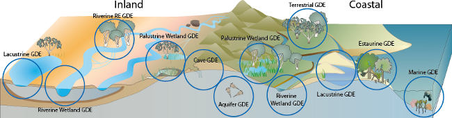 GDEs include aquifers, caves, lakes, palustrine wetlands, lacustrine wetlands, rivers and vegetation.