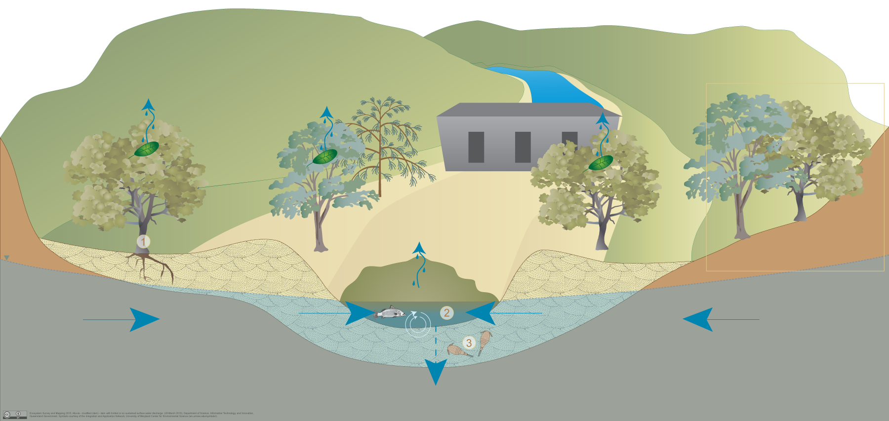 Click on elements of the model or select from the tabs below Alluvial aquifers with dams with limited or no sustained surface water dischargeAlluvial aquifers are formed from particles such as gravel, sand, silt and/or clay deposited by fluvial processes in river channels or on floodplains. These deposits store and transmit water to varying degrees through inter-granular voids. These aquifers may have structures, such as dams, that modify the flow of surface water and groundwater. Where dams restrict the discharge of surface water, there is less recharge of downstream alluvial aquifers from channels reducing their saturation over time. This can also occur in dry or drought conditions. Both stream and alluvial aquifers may then be recharged from other adjacent aquifers (e.g. permeable rock aquifers).