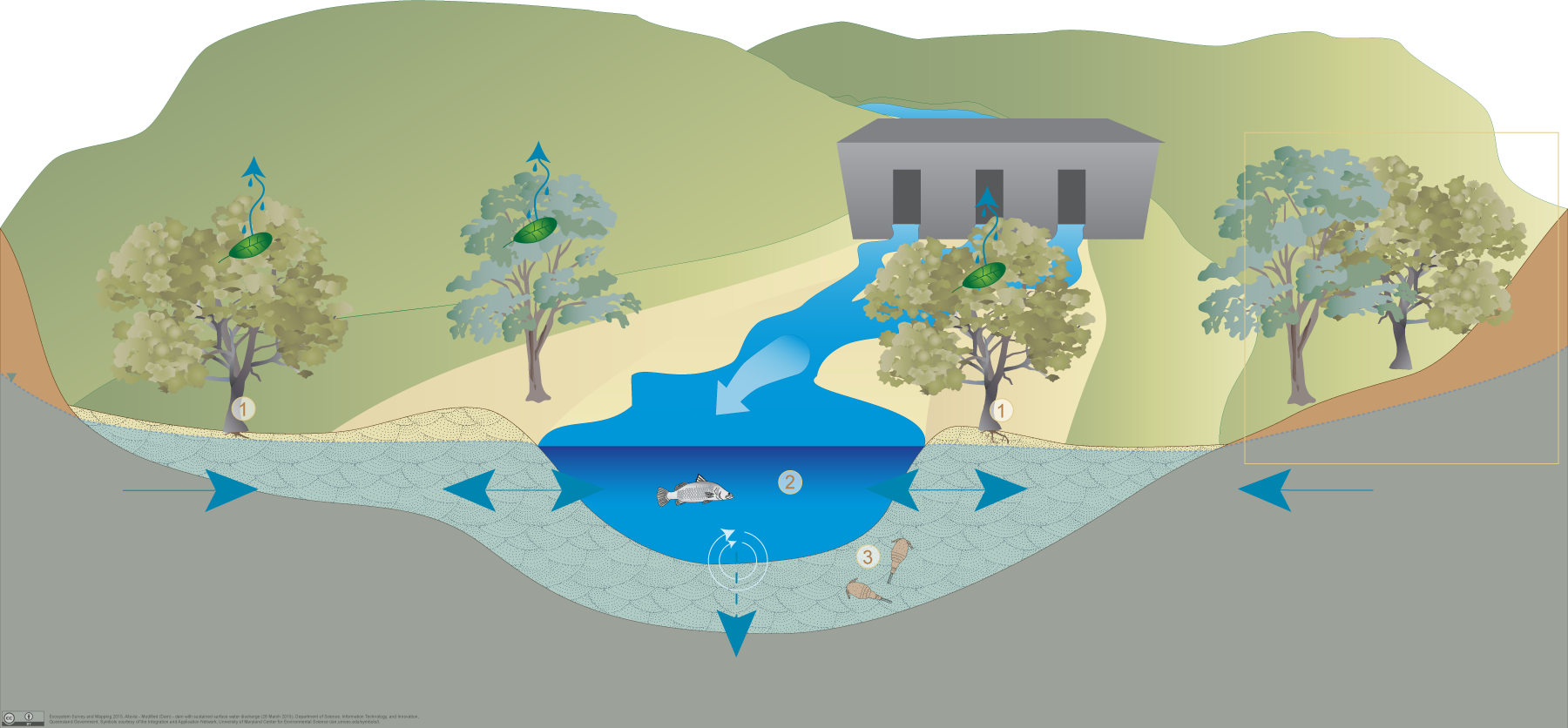 Click on elements of the model or select from the tabs below Alluvial aquifers with sustained surface water discharge downstream of damAlluvial aquifers are formed from particles such as gravel, sand, silt and/or clay deposited by fluvial processes in river channels or on floodplains. These deposits store and transmit water to varying degrees through inter-granular voids. These aquifers may have structures, such as dams, that modify the flow of both surface water and groundwater. Dams that provide a sustained release of surface water may increase recharge from the downstream channel into the alluvial aquifers, resulting in their saturation.