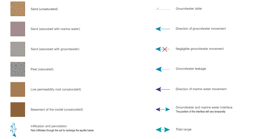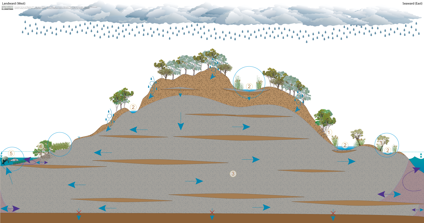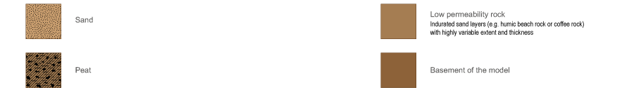 Coastal sand masses (high dunes)Coastal sand masses (high dunes)High dunes![]() Click on elements of the model or select from the tabs below Coastal sand islands with high dunes usually contain one or more unconfined, unconsolidated sedimentary aquifers, where groundwater is stored and transmitted through inter-granular voids between sand particles. These unconsolidated sedimentary aquifers may be perched due to the presence of low permeability layers within the coastal sand mass (e.g. layers of coffee rock or beach rock). Examples of coastal sand islands with high dunes along the Queensland coast include Fraser, Moreton and North Stradbroke islands. A wide range of ecosystems may depend on groundwater in these unconsolidated sedimentary aquifers to support their plant and animal communities, ecological processes and delivery of ecosystem services.