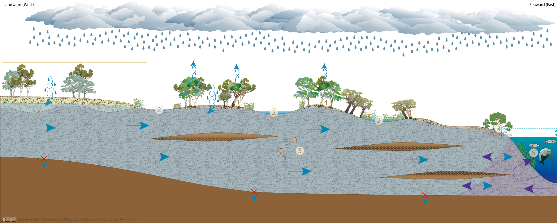 Aquifers associated with low-lying coastal swamp environments may provide a wide range of ecosystems with water required to support their fauna and flora communities, ecological processes and delivery of ecosystem services.