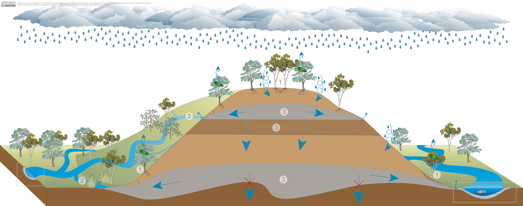 Click on elements of the model or select from the tabs below Permeable rocks can contain one or more unconfined, permeable rock aquifers, where groundwater is stored and transmitted through intergranular pore space, fractures, vesicles and/or weathered zone of the rock. When permeable rocks overlie relatively less permeable or impermeable rocks vertical groundwater movement is restricted. While groundwater will often continue to leak through the less permeable rock to some degree (e.g. through fractures), typically, groundwater moves laterally and is commonly discharged to the surface along the contact between the two rock types. Unconfined, permeable rock aquifers may provide a range of ecosystems with water required to support their plant and animal communities, ecological processes and delivery of ecosystem services.