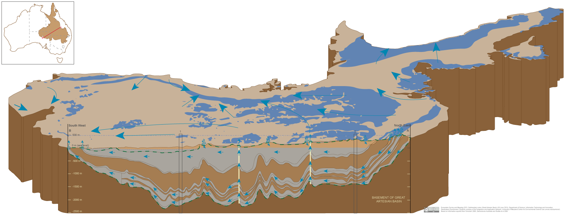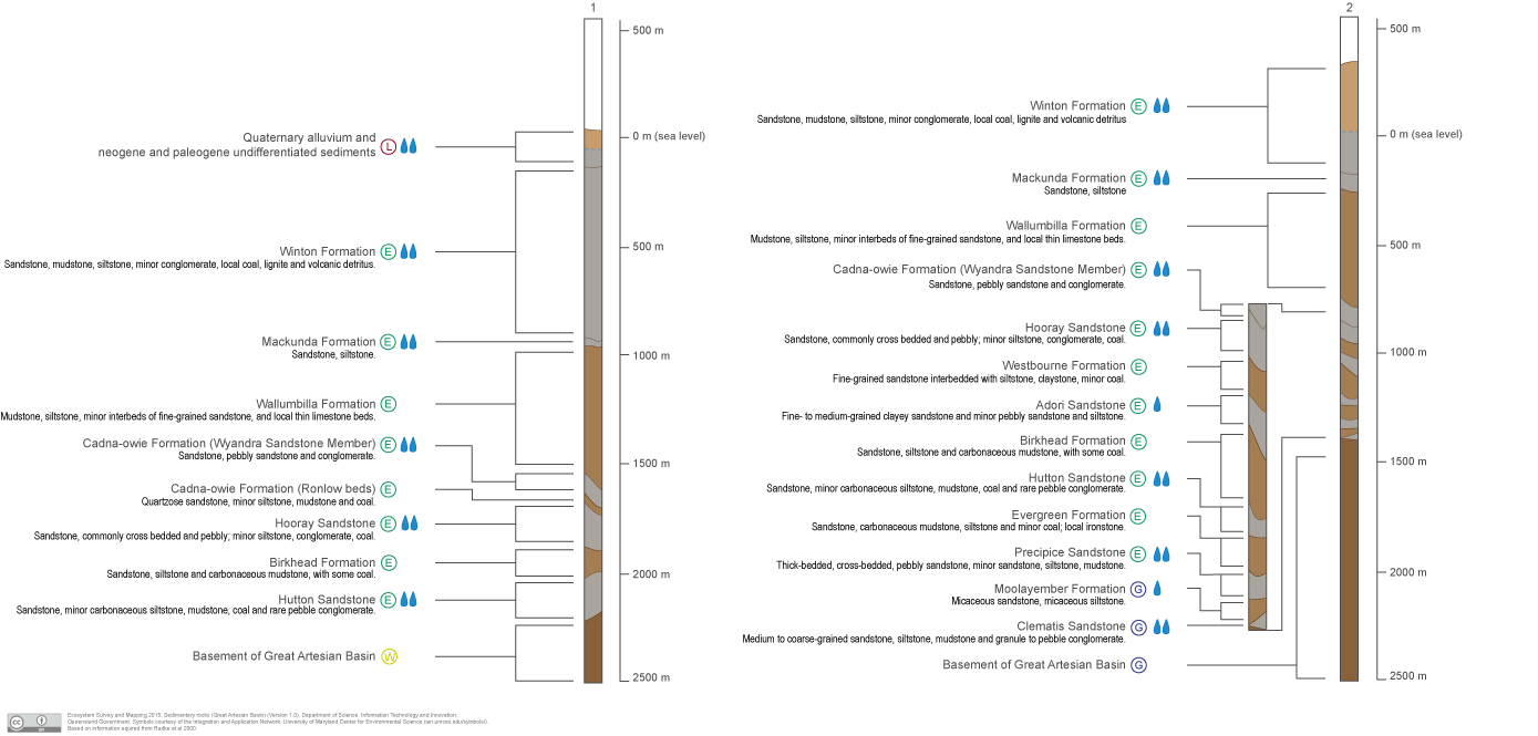 Sedimentary rocks (Great Artesian Basin)Sedimentary rocks (Great Artesian Basin)Click on elements of the model or select from the tabs below Sedimentary rocks of the Great Artesian Basin (and other adjoining and underlying basins)The Great Artesian Basin is a hydrogeological basin containing layered formations of Cretaceous, Jurassic and Triassic sedimentary rocks of variable grain size and permeability. The Great Artesian Basin is composed of various geological basins and sub-basins. Sedimentary rocks may store and transmit groundwater through inter-granular pore space, fractures and weathered zones. The geological formations shown in the cross-section of this model will apply to the Queensland Lake Eyre Basin (drainage basin) footprint. Sedimentary rocks with coarser grain size (for example, the Precipice Sandstone) are generally more permeable than those with finer grain size (such as the Wallumbilla Formation). Groundwater can discharge locally (e.g. springs) at the surface from the sedimentary rock aquifers typically along footslopes, fault or fractures. Younger geological material such as those that comprise the Lake Eyre Basin (drainage basin) may overlie the sedimentary rocks of the Great Artesian Basin and these landscapes are depicted in other conceptual models. Sedimentary rock aquifers may provide a range of ecosystems with water required to support their fauna and flora communities, ecological processes and delivery of ecosystem services.