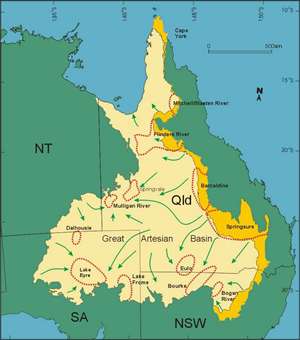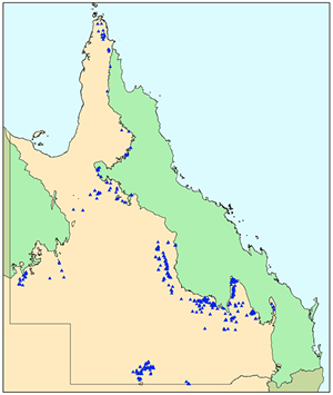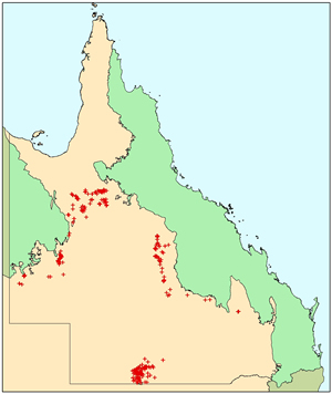 Some species that occur in springs and the spring community itself are also listed under the Commonwealth legislation Environmental Protection and Biodiversity Conservation Act (EPBC). Information on this legislation and the species and communities it seeks to protect can be accessed at www.ea.gov.au/biodiversity/threatened/index.html Queensland Springs—distribution and assessmentThe Queensland Springs database presents data from a survey of springs conducted between 1995 and 2002 for some areas of the Great Artesian Basin in Queensland (excluding Cape York Peninsula). It also includes data from other areas that is substantially incomplete. The database includes the locations of springs and their flow status (active or inactive). The presence of plant species listed as rare, vulnerable or endangered under the Nature Conservation and Other Legislation Amendment Regulation (No. 1) 2000 is also included. Spring wetlands in seasonally arid QueenslandSeven springs in seasonally arid Queensland, including those outside the Great Artesian Basin, were listed as distinct regional ecosystems by Sattler and Williams[7] (1.10.6; 2.10.8; 4.3.22; 5.3.23; 6.3.23; 10.10.6; 11.3.22). Fensham, Fairfax and Sharpe[3] investigated the floristic variation within the spring wetlands of seasonally arid Queensland, using survey information from both Great Artesian Basin springs and permanent springs associated with other aquifers. It indicated that the regional ecosystem framework provides a satisfactory means of classifying springs. The study indicated that the flora of springs of the Great Artesian Basin aquifers are distinct from other springs in seasonally arid Queensland, but that all have substantial conservation values. The value of the springs as cultural sites, particularly for aboriginal communities, is also very high. In September 2003, an additional seven regional ecosystems (1.11.5; 2.3.39; 6.7.18; 9.8.8; 9.10.2; 10.3.31; 11.10.14) were recognised and included in the Vegetation Management Act 1999 regulation, and are described in the Regional Ecosystem Description Database. Ecological value and conservation issues for the Great Artesian Basin springsThe springs of the Great Artesian Basin provide habitat for a number of endemic plants, as well as fish, snails and other invertebrates[5]. Fensham and Fairfax[1] described results from a comprehensive ground survey of the spring wetlands associated with the Great Artesian Basin in Queensland. That study confirmed and extended previous findings from South Australia[6] regarding the significance of the biological values of the springs emanating from the Great Artesian Basin. The conservation values of Great Artesian Basin springs have been ranked on the basis of their endemic plant populations and the habitat they provide for isolated populations of plant species[2]. The water pressure in the Great Artesian Basin has declined substantially because of the extraction of water from bores, putting the long-term sustainability of the resource at risk. This has serious implications for both the agricultural and mining sectors that use the Great Artesian Basin. A large amount of public money is being spent on rehabilitating bores with the aim of restoring aquifer pressure. Spring flows have also declined, particularly in discharge areas, and preservation of their natural values is highlighted as an important justification for the rehabilitation program (Great Artesian Basin Consultative Council 2000). What are current threats to Great Artesian Basin spring wetlands?The current threats are: