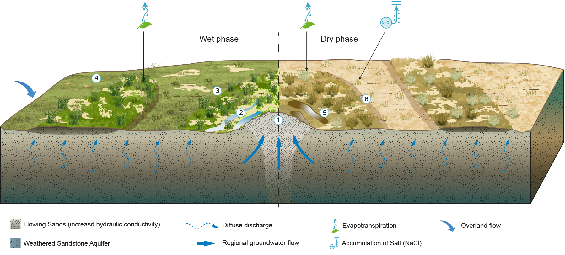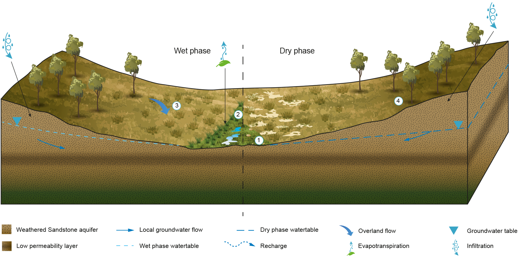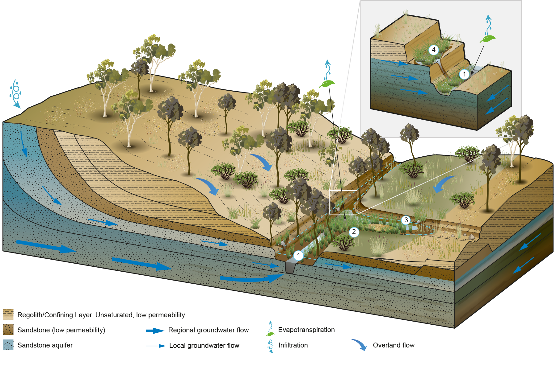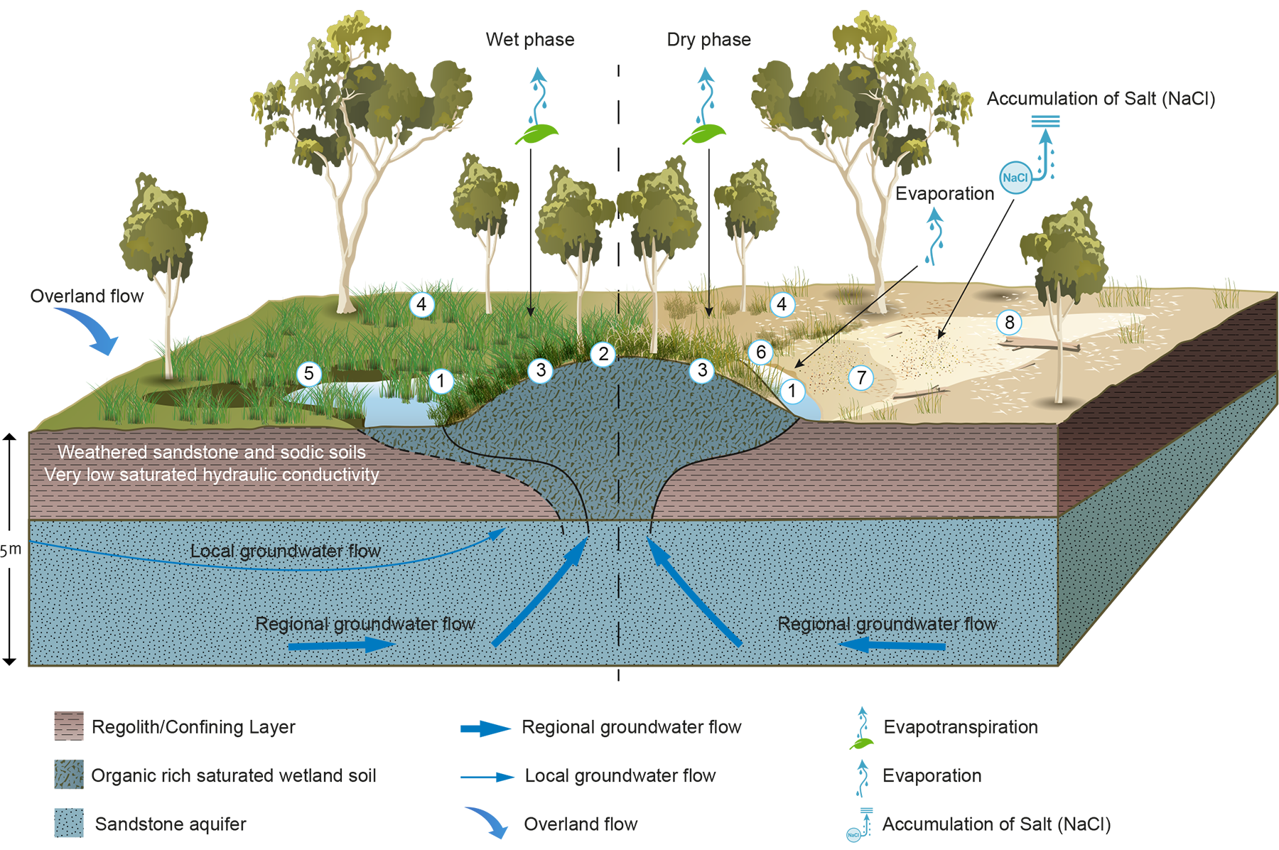 Discharge from the wetland is maintained all year and is either within, or adjacent to, permanent or semi-permanent watercourses. The shape and size of the wetland are controlled by the nature of the exposed sandstone and the geomorphology of the watercourse. The constant exchange of water due to discharge from the wetland and flow of low-salinity groundwater into the wetland generally maintains low-salinity water within the wetlands.