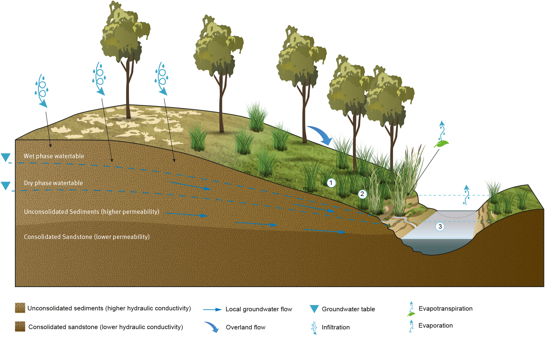 Type 3 wetlands have formed due to dissection of the landscape by riverine processes which results in the watertable being intersected within a sandstone aquifer. This creates zones of groundwater discharge (wetlands) adjacent to, or within permanently or seasonally flowing streams. Three focal zones have been proposed that represent the variability across the wetlands driven by the groundwater regime: