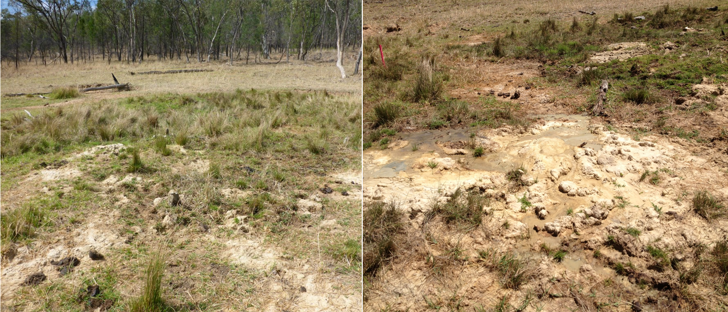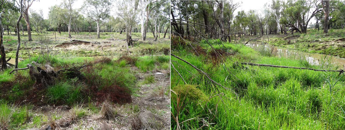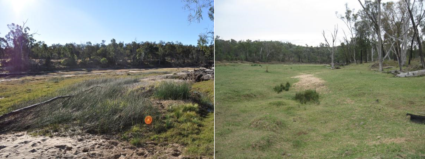Adjacent bare areas dominated by a sparse cover of terrestrial grasses and sedges including Juncus spp., Eragrostis spp. and Bothriochloa bladhii.