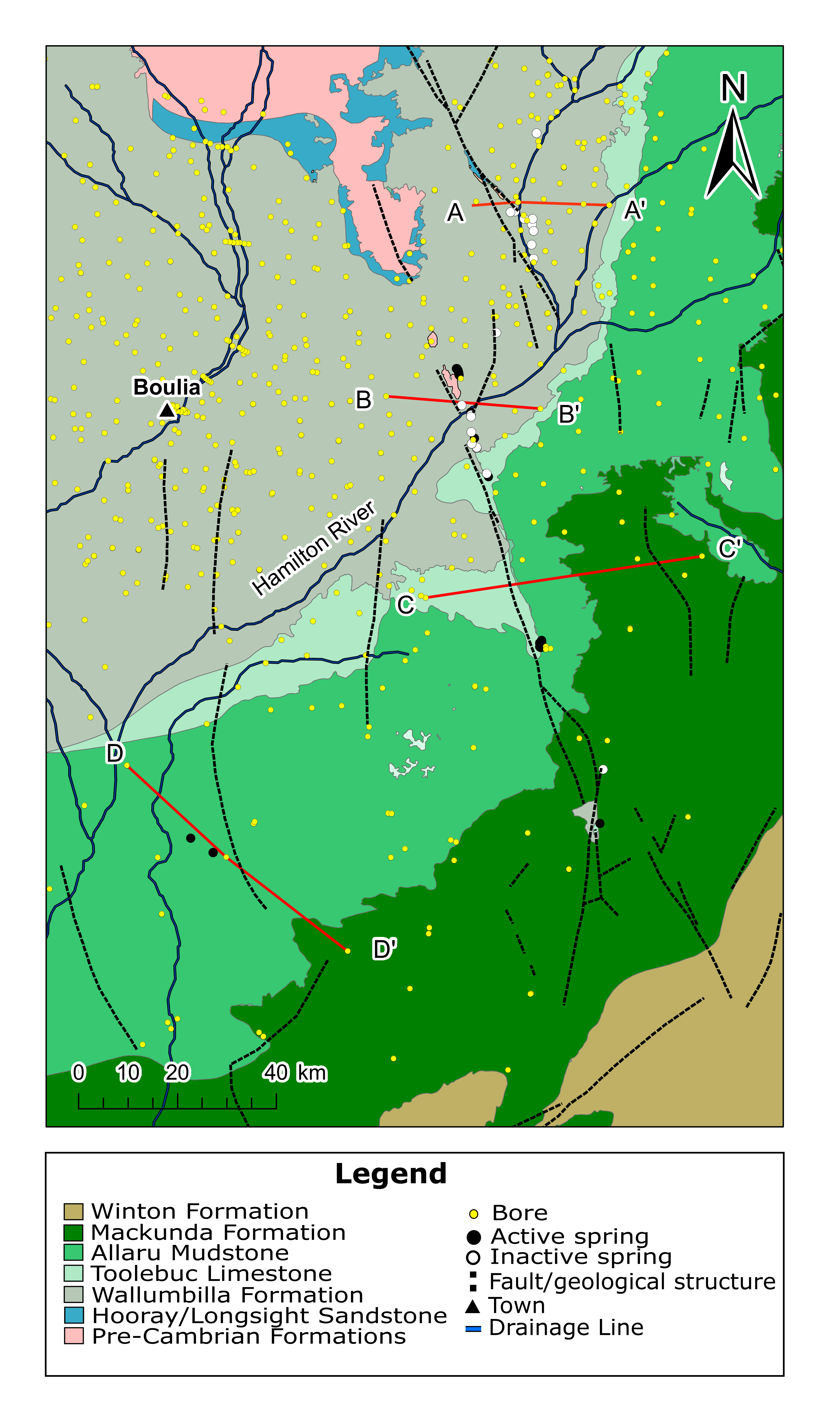 Fault structures are generally aligned north-south and probably arose in the Proterozoic. Minor movements along these structures, including the Burke River structure, during the early Tertiary have created faults and folds in the Cretaceous sediments allowing groundwater to discharge through springs.