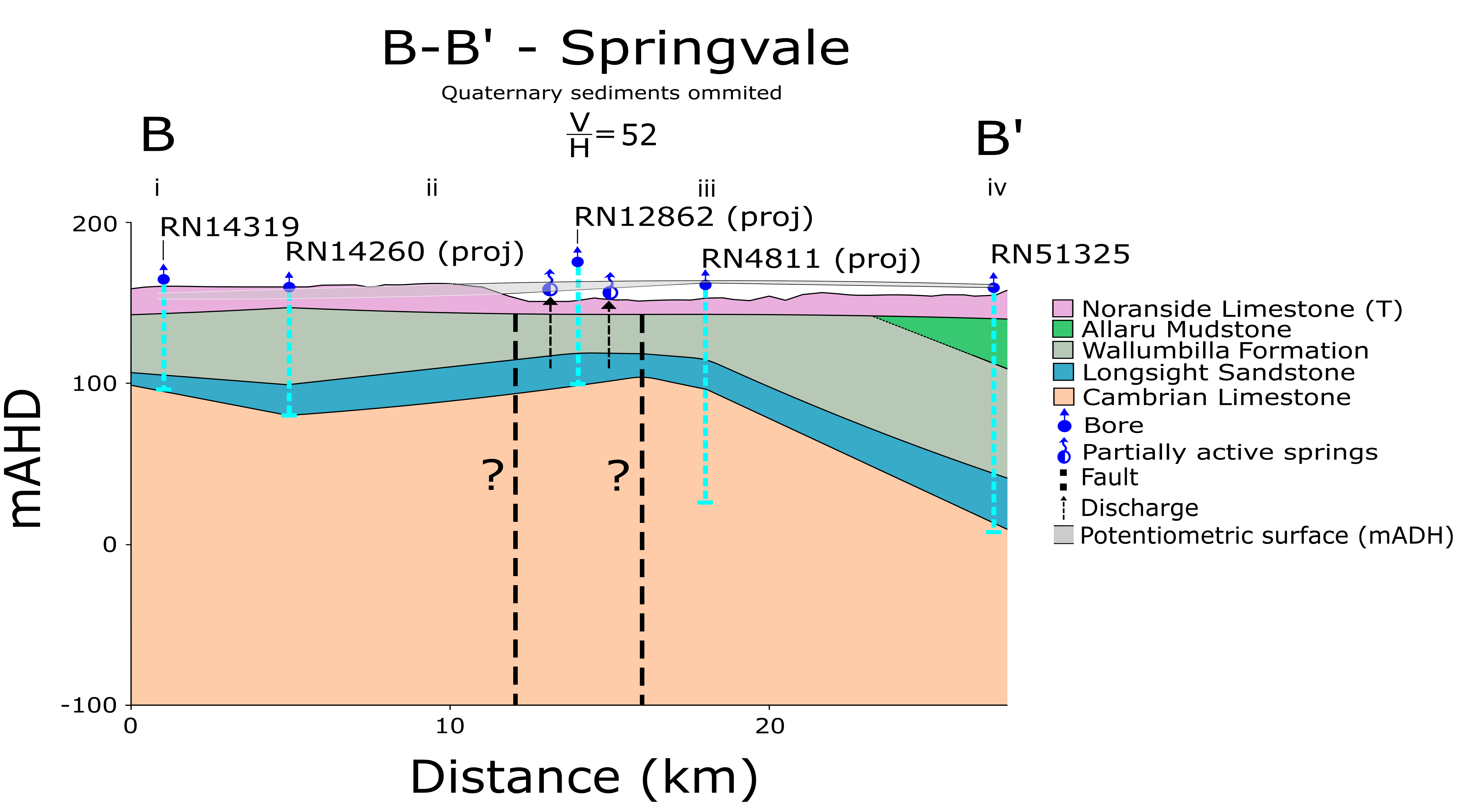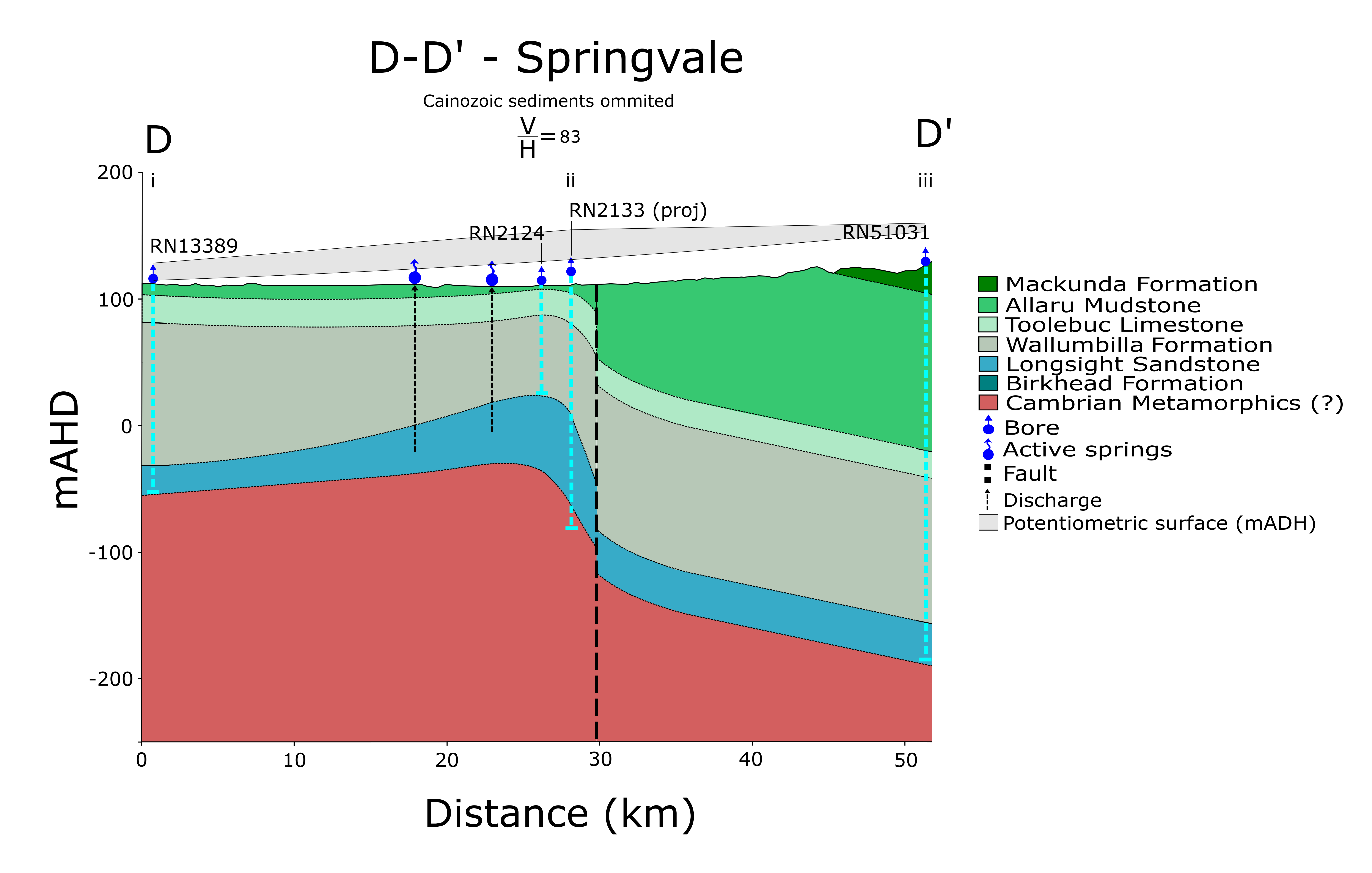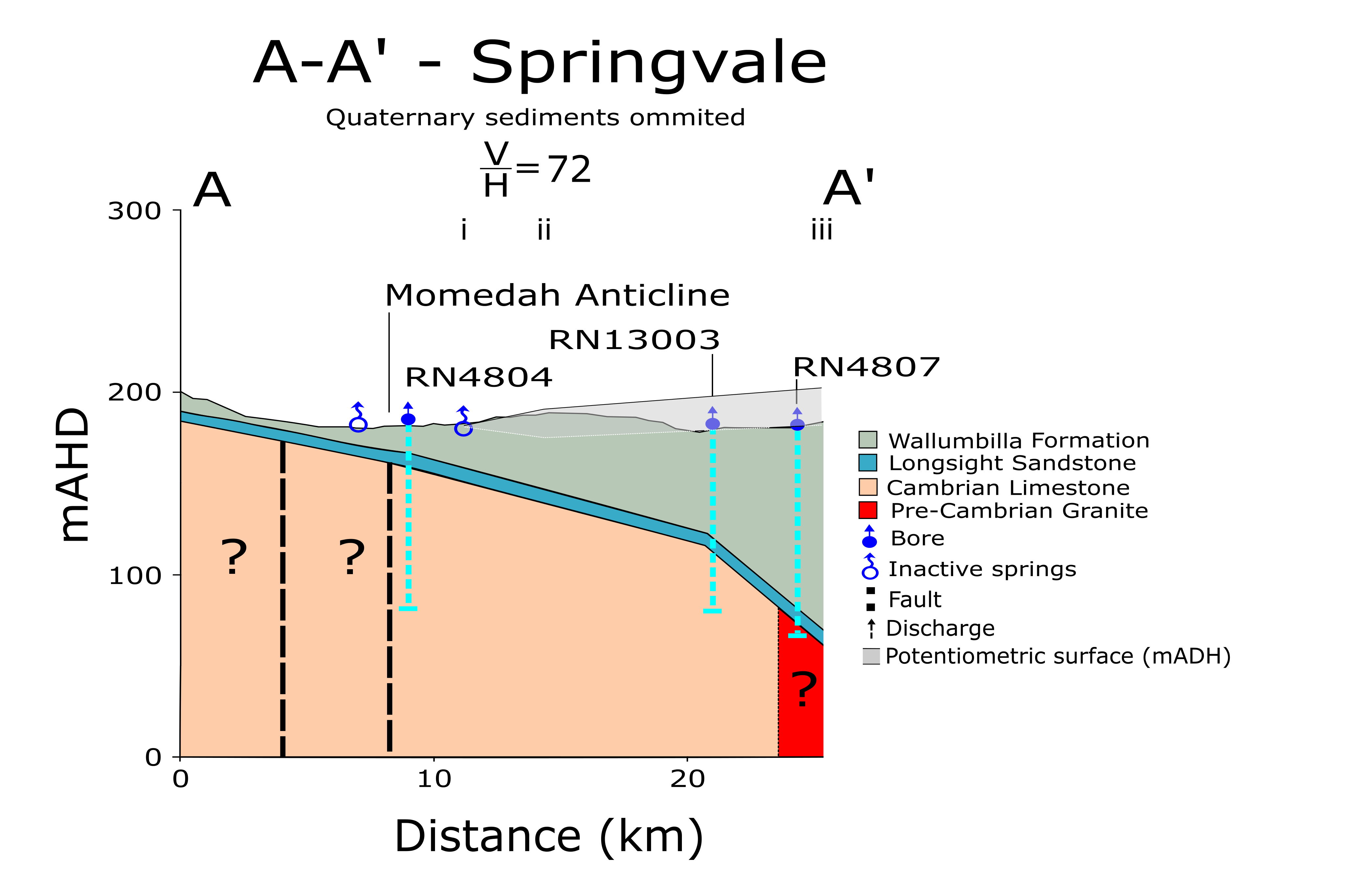 The granite basement of the Eromanga Basin in the vicinity of the Springvale supergroup is about 1000m deep. Above this basement there is a sequence of Proterozoic and Paleozoic sediments, including sandstones, shales and limestones. There is a major unconformity between these sediments and the overlying Longsight Sandstone of lower Cretaceous age. This is the main aquifer unit in the region and is overlain by a sequence of Cretaceous sediments, mostly comprised of fine-grained sediments including the Wallumbilla Formation, the Toolebuc Formation (limestone), the Allaru Mudstone and the Mackunda Formation. There are also Tertiary deposits including sandstones and limestones.