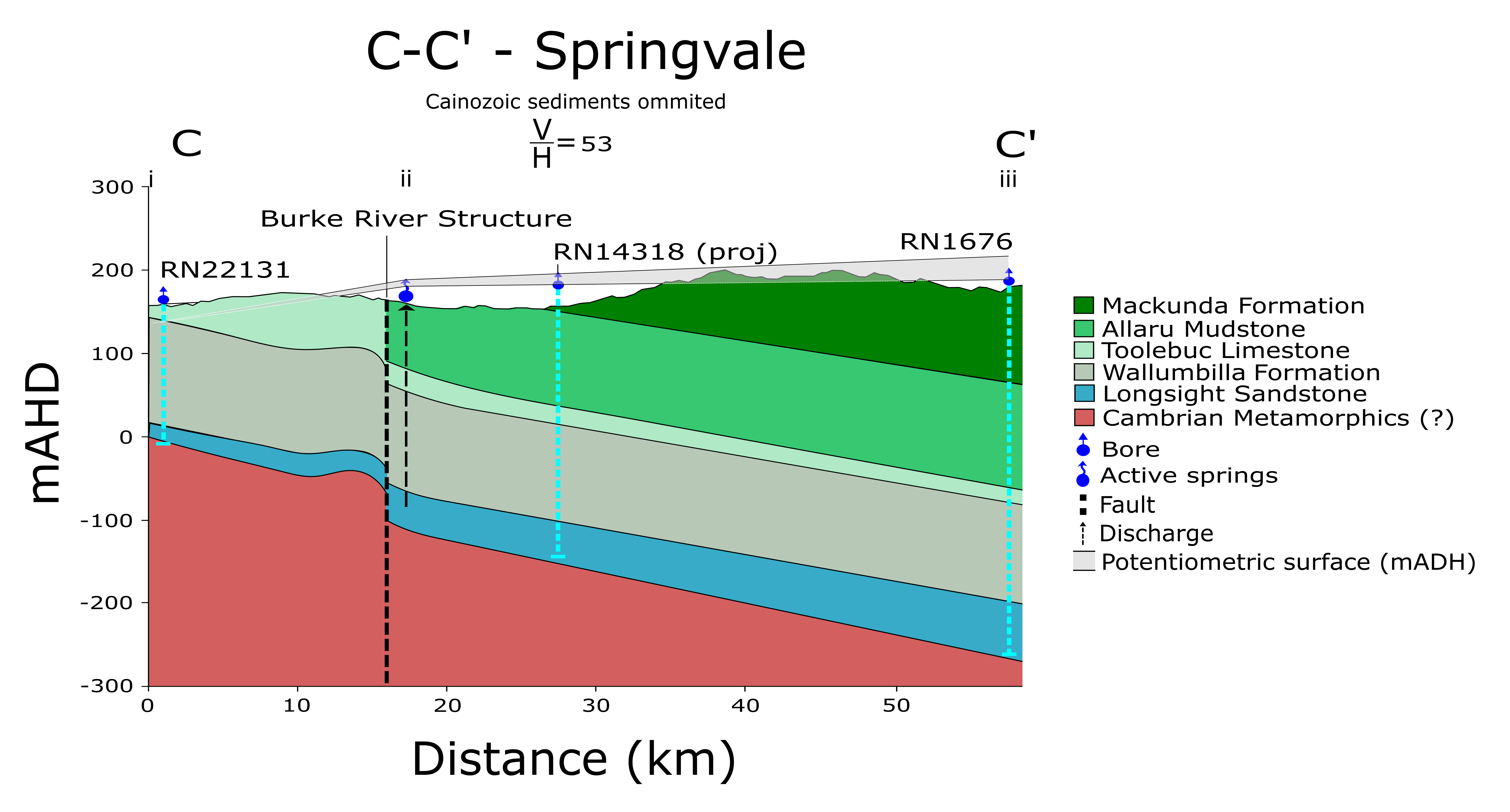 Most of the discharge springs in this supergroup are aligned along a northerly trending fault the Burke River Structure (habermehl 1982). The fault has resulted in substantial displacement of the underlying Proerozoic and Paleozoic rocks and folded and faulted the Mesozoic sediments to the extent that groundwater discharges from the uppermost water-bearing aquifer the Longsight Sandstone (Hooray Sandstone equivalent). At Elizabeth Springs the displacement within the Longsight Sandstone aquifer appears to be in the vicinity of 30 m. Regional flows in the GAB in the vicinity of this fault structure are from the east to the west. It appears that the potentiometric surface dissipates substantially as a result of the fault.