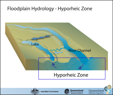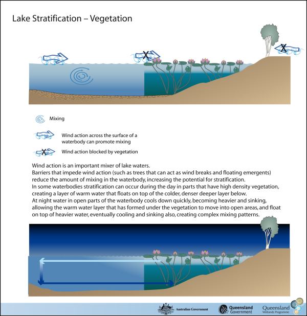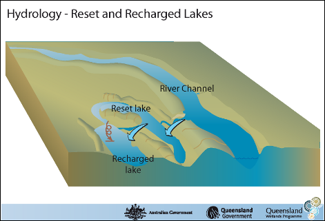 A wealth of factors determines water quality parameters in a lake. One factor that has a large impact is whether a floodplain lake is reset or recharged by flood waters and how frequently that occurs. waterbodies that are recharged by floodwaters retain most of the water that flows into them. Hence they also retain most of the sediment that flows in, regardless of whether or not it settles. However, sediment loading is limited due to low inflow volumes, loading in this case being simply equivalent to the water volume multiplied by the suspended sediment concentration. These sites often contain poorly sorted, consolidated bottom sediments. In contrast, much of the water that flows into waterbodies that are reset by floods will overflow into other parts of the floodplain and/or returns to the river when the flood subsides. Input volumes are much higher than in similar-sized recharge sites but this results in increased sediment loading only if suspended sediments contained in the floodwaters passing through the water body can settle before the waters leave. Typically this could take hours or weeks, so virtually all particles larger than silt will settle. But most clay and colloid-sized particles will remain suspended and will therefore be carried away by flows. Other factors being equal, waterbodies that temporarily detain large volumes of slowly flowing floodwater tend to accumulate the largest quantities of fine silty benthic sediment. Moreover, water residence times are highest in deep permanent sections of the water body so the average size of the sediment particles that reach the bottom are significantly smaller. Sites of this kind can contain thick (meter-deep) soft muddy bottom sediments. Floodplain lake hydrology![]() ![]() ![]() ![]() ![]() ![]() The hydrology of floodplain lakes is related to a site’s topography, substrate type and position within the catchment. Climatic factors (especially those related to rainfall) also play a significant role in the regularity, seasonality, duration and amount of water entering and leaving the wetland. Water inputsFloodplain wetlands can be flushed with water from overbank flow, streams leading directly to the site, sheet flow across the floodplain, rainfall, run-off from the local watershed, hyporheic flow and from other groundwater sources, or a combination of these sources. If groundwater table levels and substrate permeability permit, this can lead to more constant systems. This wetland habitat type can play a role in groundwater recharge/discharge. An important point to note is that hyporheic flow and groundwater flow tend be clear (not turbid), compared to surface water flow. Water outputsEvaporation, transpiration and groundwater recharge can lead these systems to dry out, often completely. Overbank floods move out onto the floodplain or back to the channel, connecting the wetland habitat to other wetland habitats in the floodplain. Water may also flow out to the ocean via distributary channels, depending on topography. Hyporheic flowWater flowing through a river can move through the sediments beneath and adjacent to the channel. This is termed the hyporheic zone, where surface water and groundwater mix. The water that flows through this zone is termed hyporheic flow, subsurface flow or base flow, and can be an important source of water for floodplain lakes and swamps. Due to filtering by alluvial sediments (e.g. sand) hyporheic flow tends to be less turbid (clearer) than surface water flow. StratificationStratification is driven by density differences within the one waterbody. Temperature has a significant effect on water density—warmer water is less dense and therefore will float on top of colder water (of the same salinity). 1. Sunlight warms the upper surface of the lake (the epilimnion), making it less dense than the water below, allowing it to float and discouraging mixing (hence inducing stratification). Only a small temperature difference is required to prevent mixing between layers, depending on the lake’s surface area, shape and wind fetch. 2. The stratification can break down through a decrease in surface temperature from cooler air temperatures that occur either at night time or seasonally, depending on the lake’s climate and other characteristics. The decreasing density of the cooling surface water, along with wind action, causes this surface water to sink and mix with the deeper water. During this time period, most of the lake water is at the same temperature, and surface and bottom waters can mix freely. The decreasing density of the cooling surface water, along with wind action cause this surface water to sink and mix with the deeper water. During this time period, most of the lake water is at the same temperature, and surface and bottom waters can mix freely. Stratification zonesUnder certain conditions related to temperature, wind mixing, salinity, waterbody depth and vegetation cover, Queensland lakes can stratify into different layers. The upper layer of a waterbody is a warmer (andtherefore lighter), well mixed zone called the epilimnion. Below this is a transitional zone called the metalimnion, where temperatures rapidly change with depth. The thermocline is a horizontal plane within the metalimnion at the zone of greatest water temperature change. The metalimnion is very resistant to wind mixing. Beneath the metalimnion, and extending to the lake bottom, is the colder, heavier, darker and relatively undisturbed hypolimnion. More hydrology information is available in the chronology of a flooding lake. MixingStratified lakes allow very little mixing between the lake surface and the lake depths, virtually cutting off the oxygen supply to the unmixed bottom layer (the hypolimnion). When there is little oxygen input from submerged plants (due to low light levels, for example) or when a large amount of organic matter has stimulated the growth of oxygen-consuming bacteria, the water in the unmixed bottom layer (hy
