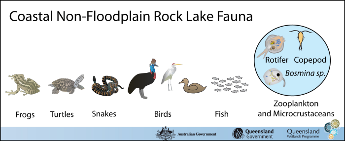 Mammals, birds, reptiles and frogs often occur in and around non-floodplain rock lakes and/or live nearby and visit to drink or feed at the waterbody. A variety of waterbirds, including some migratory species, use non-floodplain rock lakes to feed and nest. In some areas non-floodplain rock lakes are relatively isolated and provide significant refuge for flora and fauna. Because of the isolation of non-floodplain lakes (crater lakes in particular) some wildlife are endemic to particular lakes or the ecosystems that directly surround them. This is particularly the case for aquatic organisms like fish and frogs that can’t access nearby waterbodies due to the lack of connectivity associated with non-floodplain systems. Zooplankton and microcrustaceans—microscopic aquatic fauna that graze on phytoplankton and detritus—are also present in coastal non-floodplain rock lakes.