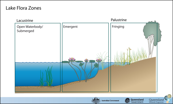 Oligotrophic (low nutrient) lakes are often surrounded and, if shallow, invaded by dense strands of sedges and rushes such as Lepironia articulata, Eleocharis spp., Baumea spp., Schoenus spp., Juncus spp. and Gahnia spp. The deeper areas of lakes are generally vegetation-free. Throughout Queensland, L. articulata is commonly associated with coastal dune lakes. However, species such as Baumea teretifolia, Eleocharis sphacelata, Leptocarpus tenax, common in south-east Queensland, are usually replaced with the species B. rubiginosa, E. brassi and Dapsilanthus ramosus in Cape York coastal dune lake areas. Coastal dune lakes can occur alongside a diverse range of wetland habitats and vegetation types including beaches, mangroves, salt flats, swamps, sedgelands, heathland and rainforest, depending on their exact location. Where lake levels fluctuate, vegetation surrounding the lake is highly water tolerant and may include species such as sundews (genus Drosera) and bladderworts (genus Utricularia).