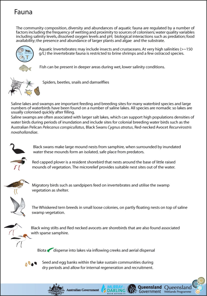 Last updated: 22 March 2013 This page should be cited as: Department of Environment, Science and Innovation, Queensland (2013) Arid and semi-arid saline swamp – Fauna, WetlandInfo website, accessed 8 May 2025. Available at: https://wetlandinfo.des.qld.gov.au/wetlands/ecology/aquatic-ecosystems-natural/palustrine/arid-saline-swamp/fauna.html |