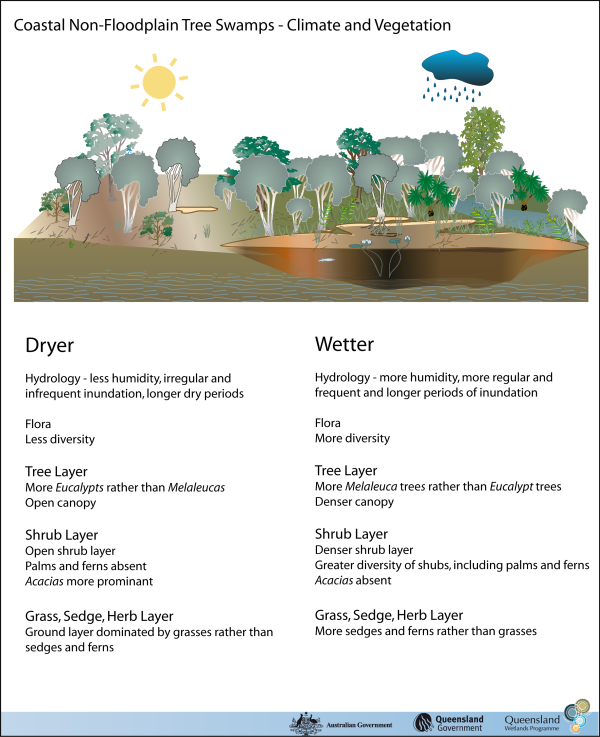 Different Melaleuca species are associated with slightly different soil types and water regimes conditions - flora diversity with climate pop out. Research suggests that the growth of Melaleuca quinquenervia can have a significant effect on the local soil chemistry and groundwater, increasing acidity (decreasing pH), changing redox potential and dissolved organic carbon levels. Though Melaleuca spp. trees cannot survive permanent inundation they do have adaptations such as fibrous or adventitious roots around their lower trunk that are thought to function as breathing roots, helping the tree to survive during long periods of submersion. The trees also have spreading root systems, providing stability during floods and prolonged water logging and most species are tolerant to a limited extent of both saline and brackish water. Tropical regional ecosystems3.3.32Melaleuca viridiflora ± M. saligna woodland in sinkholes and drainage depressions Occurs in sinkholes and drainage depressions. 3.3.50aMelaleuca viridiflora ± Petalostigma pubescens low open woodland on low plains Occurs on low-lying plains. 7.3.5aMelaleuca quinquenervia open-forest, woodland and shrubland, on poorly drained alluvial plains. Occurs on lowlands of the very wet and wet rainfall zone, on poorly drained peaty humic gley soils where the water table is near or above the ground for most of the year. Sub-tropical regional ecosystems12.2.7Melaleuca quinquenervia or M. viridiflora open forest to woodland on sand plains Occurs on Quaternary coastal dunes and seasonally waterlogged sand plains usually fringing drainage system behind beach ridge plains or on old dunes, swales and sandy coastal creek levees. 12.5.4aMelaleuca quinquenervia and or M. viridiflora woodland Occurs on complex of remnant Tertiary surfaces and Tertiary sedimentary rocks. Melaleuca spp. trees can flower all year round, providing an almost constant source of nectar and pollen, which is particularly important in winter for insects, birds and bats. Last updated: 22 March 2013 This page should be cited as: Department of Environment, Science and Innovation, Queensland (2013) Coastal and subcoastal non-floodplain tree swamp—Melaleuca spp. and Eucalyptus spp. – Flora, WetlandInfo website, accessed 8 May 2025. Available at: https://wetlandinfo.des.qld.gov.au/wetlands/ecology/aquatic-ecosystems-natural/palustrine/non-floodplain-tree-swamp/flora.html |