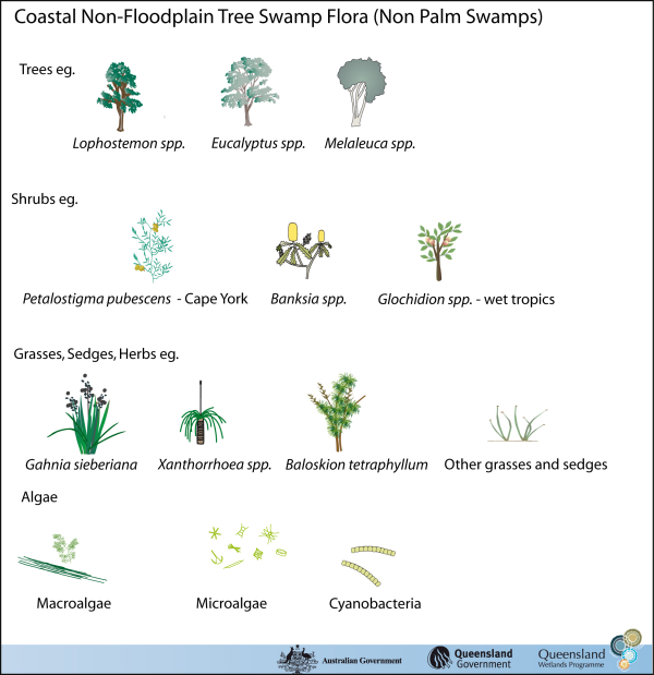 Coastal and subcoastal non-floodplain tree swamp—Melaleuca spp. and Eucalyptus spp.Coastal and subcoastal non-floodplain tree swamp—Melaleuca spp. and Eucalyptus spp. – FloraClick on elements of the model or select from the tabs below ![]() ![]() Melaleuca spp. can form almost pure stands and therefore floristic diversity is not necessarily a function of health in these systems. On flat land with good subsoil moisture Melaleuca spp. can occur alongside eucalypts in mixed tall open-forests. Other flora types (depending on the swamp’s positions within the landscape and its water regimes) include:
