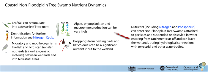 Sources of nutrients include nutrients carried in surface water flow into the wetland habitat and droppings from nesting birds and bat colonies can also be a significant nutrient input to the wetland. Nutrients can leave these Coastal Non-Floodplain Tree swamps through the same mechanisms – through water flow out of the wetland habitat, and migratory and mobile organisms (such as birds) transporting nutrients to other parts of the terrestrial or estuarine landscape. Nitrogen can be transferred from the wetland into a less biologically available form in the atmosphere through the process of denitrification. High levels of organic carbon, high temperatures, high nutrients (particularly nitrate) and low levels of oxygen in areas inundated with water create ideal conditions for denitrification to occur. Melaleuca spp. trees can survive under conditions comparable with nutrient enrichment by sewage and therefore can be a considerable store or source of nutrients, depending on conditions. Melaleuca spp. trees transfer nutrients from the sediment and water column into plant growth and then into senescent leaf fall. Fallen Melaleuca leaves break down very slowly due to their high carbon content (which is largely made up of decay-resistant lignins) and anti-bacterial compounds. Leaves can therefore accumulate on the ground to form a dense leaf litter matt. This litter matt can be a long-term nutrient store in Melaleuca wetlands as, even during flooding conditions, the matt can remain intact, only losing freshly fallen leaves through physical removal and leaching soluble organics (not nitrogen and phosphorus). Though Melaleuca forest production is relatively high, algae (in the shallows), phytoplankton (in deeper waters) and macrophyte production can be even higher in these habitat types, with faster growth and recycling rates.