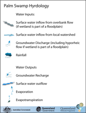 Coastal and subcoastal tree swamp—PalmCoastal and subcoastal tree swamp—Palm – HydrologyClick on elements of the model or select from the tabs below Palm swamps are commonly associated with the high rainfall of the Wet Tropics region (greater than 3000 mm annual rainfall). They grow in soil that is very poorly drained due to a depressional position in the landscape and/or the almost constant presence of a high water table. The water source for palm swamps is, therefore, the high rainfall and the high water table. Most palm swamps are non-floodplain systems. However, there are some that are associated with coastal lowlands in floodplains; these would also receive water from overbank flow of stream channels. Water outputs would typically be related to recharge of groundwater systems, evaporation and the flow of water down gullies where topography allows.