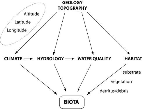 The riverine conceptual models presented in this section deal solely with naturally occurring processes and do not focus on anthropogenic (human) impacts. The major natural processes which drive the physical (e.g. flow regimes, temperature, habitat availability) and chemical (e.g. pH, Nutrient concentrations) composition of the river systems and consequently determine the biota of the province. The major subgroups are: Climate, Geology and Topography, Habitat, Hydrology, and Water Quality (see diagram).