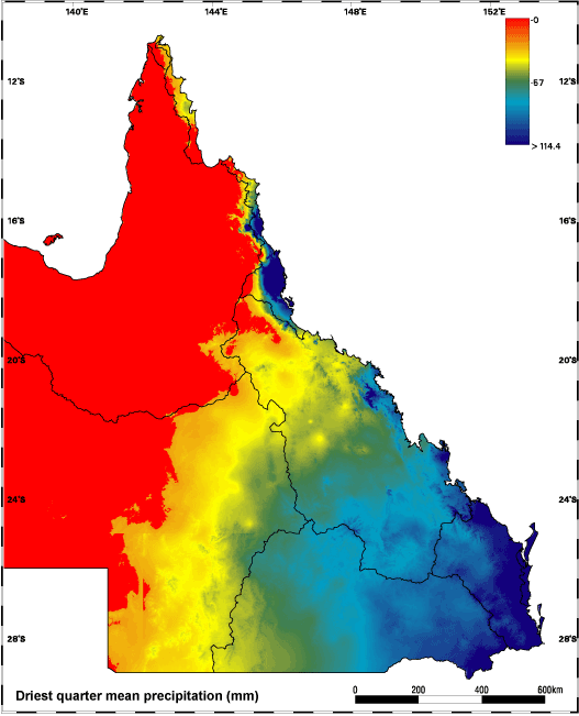 Last updated: 22 March 2013 This page should be cited as: Department of Environment, Science and Innovation, Queensland (2013) Driest quarter mean precipitation, WetlandInfo website, accessed 8 May 2025. Available at: https://wetlandinfo.des.qld.gov.au/wetlands/ecology/aquatic-ecosystems-natural/riverine/freshwater-biogeo/background/qld-dqmp.html |