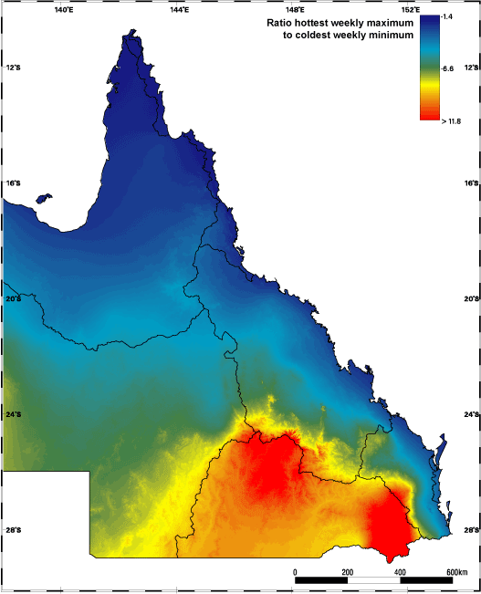 Ratio of hottest weekly maximum to coldest weekly minimum temperature