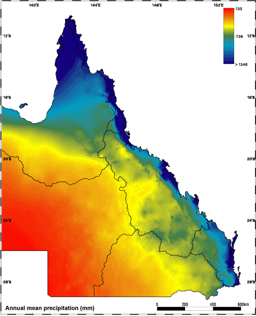 Last updated: 22 March 2013 This page should be cited as: Department of Environment, Science and Innovation, Queensland (2013) Annual mean precipitation, WetlandInfo website, accessed 8 May 2025. Available at: https://wetlandinfo.des.qld.gov.au/wetlands/ecology/aquatic-ecosystems-natural/riverine/freshwater-biogeo/background/qld-mean-annualprecip.html |