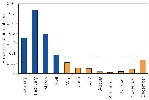 Wet and dry seasonsThe proportion of annual flow is not evenly distributed between months. The months January to April have a greater proportion of annual flow than if flow were evenly distributed, and the months May to December a smaller proportion. Based on this the wet season for the Central FBP is January to April and the dry season May to December. Compare this with the other FBPs.