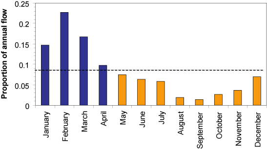 Wet and dry seasonsThe proportion of annual flow is not evenly distributed between months. The months January through to April have a greater proportion of annual flow than May to December. Based on this, the wet season for the South-East FBP is January through to April, and the dry season May to December. Compare this pattern with the other FBPs. ![]() Dotted line shows the mean/median flow Information about wet and dry seasons Last updated: 22 March 2013 This page should be cited as: Department of Environment, Science and Innovation, Queensland (2013) South-East Freshwater Biogeographic Province – Hydrology, WetlandInfo website, accessed 8 May 2025. Available at: https://wetlandinfo.des.qld.gov.au/wetlands/ecology/aquatic-ecosystems-natural/riverine/freshwater-biogeo/south-east/hydrology.html |