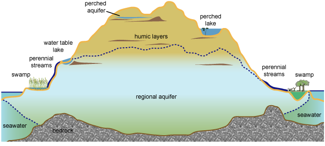 Wallum Freshwater Biogeographic ProvinceWallum Freshwater Biogeographic Province – HydrologyClick on elements of the model or select from the tabs below Little hydrology data has been collected and flow monitoring is minimal. Water systems, both standing and running, are fed from the same water source—regional and perched aquifers[7]. Unconfined bodies of groundwater are present beneath North Stradbroke, Moreton and Bribie islands, and Cooloola-Teewah sand mass on the mainland[7][3]. These regional aquifers are typically located between the Quaternary sand deposits and older bedrock of Wallum islands, characterised by a gentle dome-shape[4]. They are the result of high run-off infiltration into permeable substrates, and the density difference in fresh and sea water creating suppressive forces on the watertable[5][6][7][2]. Perched groundwater is common in the FBP, and the result of impermeable substrate layers (see Geology) inhibiting the downward movement of water, consequently forming an aquifer above the regional groundwater body[4][7][2]. Recharge of regional and perched aquifers is solely reliant on rainfall infiltration, with 30% of rainfall passing to the primary watertable on North Stradbroke Island[5][7][2].