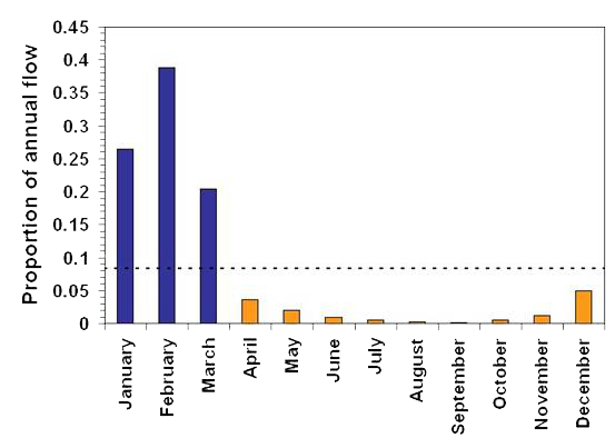 The proportion of flow is heavily biased towards the first quarter of the year. The months January to March have a much greater proportion of annual flow than April to December. Based on this the wet season for the Western Cape and Gulf FBP is January to March and the dry season April to December.