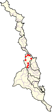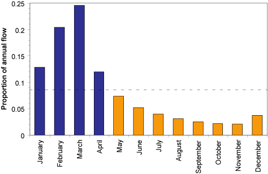 ![]() The dashed horizontal line represents the proportion of mean total annual flow in each month if it were equal for all months. The wet season is defined as months with a higher proportion than this (blue bars) and the dry season (orange bars) as months with a lower proportion. References