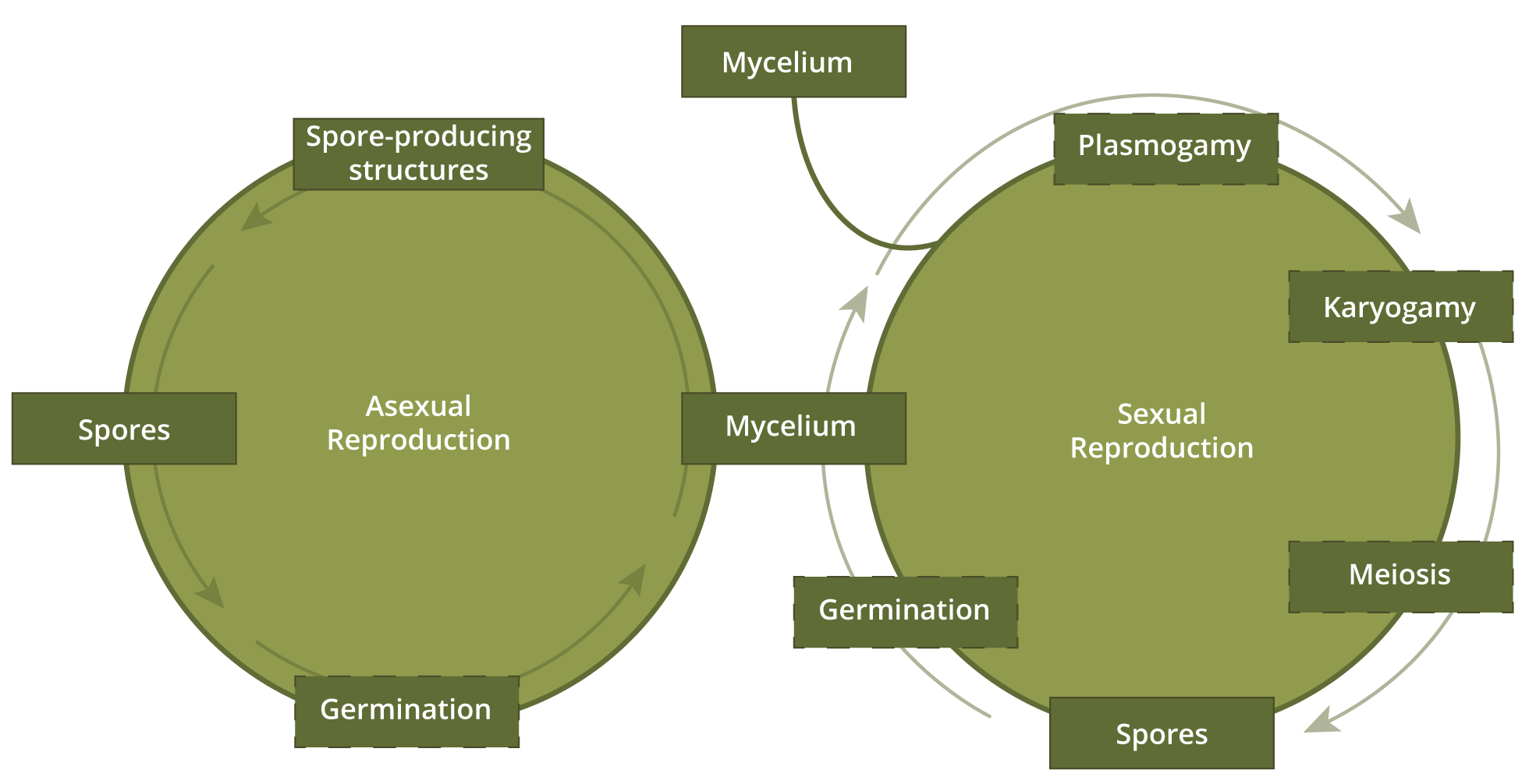 For many years fungi were considered part of the plantae kingdom, when classical theories divided all living organisms into plants and animals[8]. Fungi were the first to be separated into a third kingdom. Fungi being the first to be classified separately to animals and plants highlights how different they are from many of the species seen in the natural world. Fungi physical featuresMushrooms are the most recognisable form of fungi. However, traditional depictions of mushrooms are only of their above-ground, reproductive structures, which are only present in some species. The fungi organism is composed of a network of microscopic, filamentous structures known as hyphae, which, as a unit, make up the mycelium[8][7]. These hyphae grow in length, not width, as the organism derives energy from its surroundings. Depending on conditions, the fungi may develop reproductive structures, called fruiting bodies or sporocarps, that assist with dispersing spores[3]. Deriving energyOne of the key characteristics that separates fungi from plants is that fungi do not contain chlorophyll[10]. This means that they cannot produce energy via photosynthesis and must do so by consuming organic matter. This is achieved by the production and use of exoenzymes used to break down large molecules outside of the fungi into smaller ones. These smaller molecules are then able to be transported into fungi cells where the stored energy in organic compound bonds (e.g. found in sugars or proteins) can be extracted[2][5]. Reproduction processesWhen it comes to reproduction in fungi, two groups are described: ‘perfect’ and ‘imperfect’ fungi. Imperfect fungi are those that engage only in asexual reproduction, and perfect fungi are those that engage in both asexual and sexual reproduction. In both forms of reproduction, the process begins with the mycelium[3]. Asexual reproductionAsexual reproduction typically occurs either through the formation and dispersal of asexual spores, or via mycelia fragmentation. Asexual spores are produced through the process of mitosis and are genetically identical to the parent that they are derived from. These spores are usually released above-ground, from a sporocarp, and are commonly dispersed by wind or water, but may also be transported by mobile organisms such as insects. Mycelia fragmentation can produce multiple organisms from an individual as well. If the hyphae are broken, many species of fungi can continue to grow from a fragmented portion of the mycelium. This method of reproduction also results in an organism that is genetically identical to the parent (i.e. the source of the mycelium fragment)[6][3]. Sexual reproductionThe first step in sexual reproduction of fungi is plasmogamy, a type of cell fusion between hyphae of two different individuals. This step brings the nuclei within cells close to one another but does not fuse them. The second step is karyogamy which fuses the cells.[9]. In many other types of organisms, such as animals and plants, the above two steps occur quickly after one another, during a single event called fertilisation. However, in fungi, plasmogamy and karyogamy may have time lags between them, ranging anywhere from minutes up to centuries[9]. The final step in the sexual reproduction process, resulting in the production of spores, is meiosis. These spores are dispersed in a similar manner to asexual spores, above-ground, and via a fruiting body or sporocarp[6]. Additional information