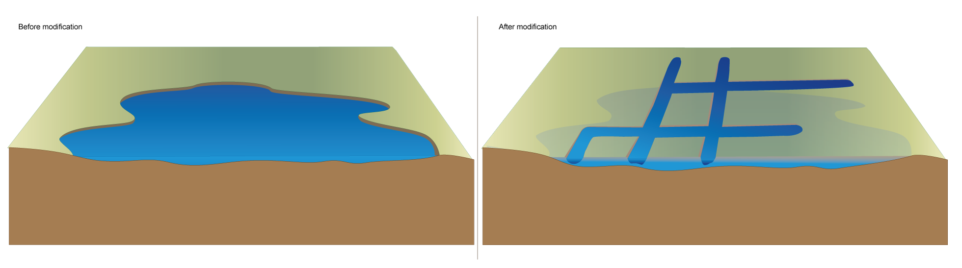 Constructed channel – Constructed channel in a wetlandSelect from the tabs below Construction of one or more riverine or intertidal wetland channels that may include evidence of excavation and/or bunding. Channel construction may openly connect to estuaries (e.g., canal estates) or other freshwater wetlands. Applicable Wetland Habitat Hydrological Modification: