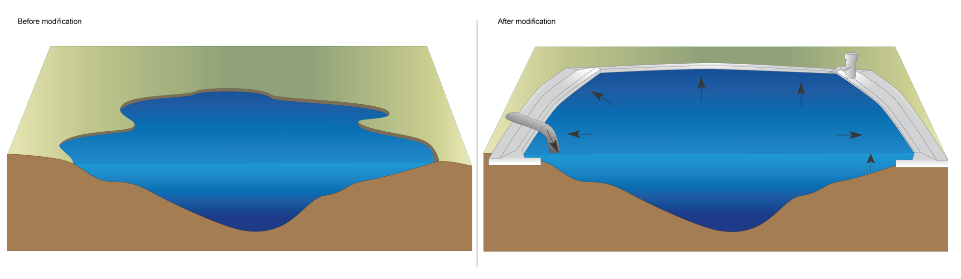Controlled surface hydrology outside a channel refers to the addition of activities and/or structures (e.g., bunds, pumps, etc.) consistent with water storage usage where surface hydrological flows are controlled. Typically, wetlands with controlled surface hydrology are semi-enclosed structures with pump facilities. Unlike bunding, controlled surface hydrology completely disconnects a wetland from natural hydrological processes. Controlled surface hydrology in a palustrine or lacustrine wetlandA palustrine or lacustrine wetland which has structures and/or activities for water storage use where surface hydrological flows are controlled. Controlled surface hydrology in a palustrine wetland may increase wetland extent and depth to such a degree converting the wetland to a lacustrine wetland system. Applicable Wetland Habitat Hydrological Modification:
