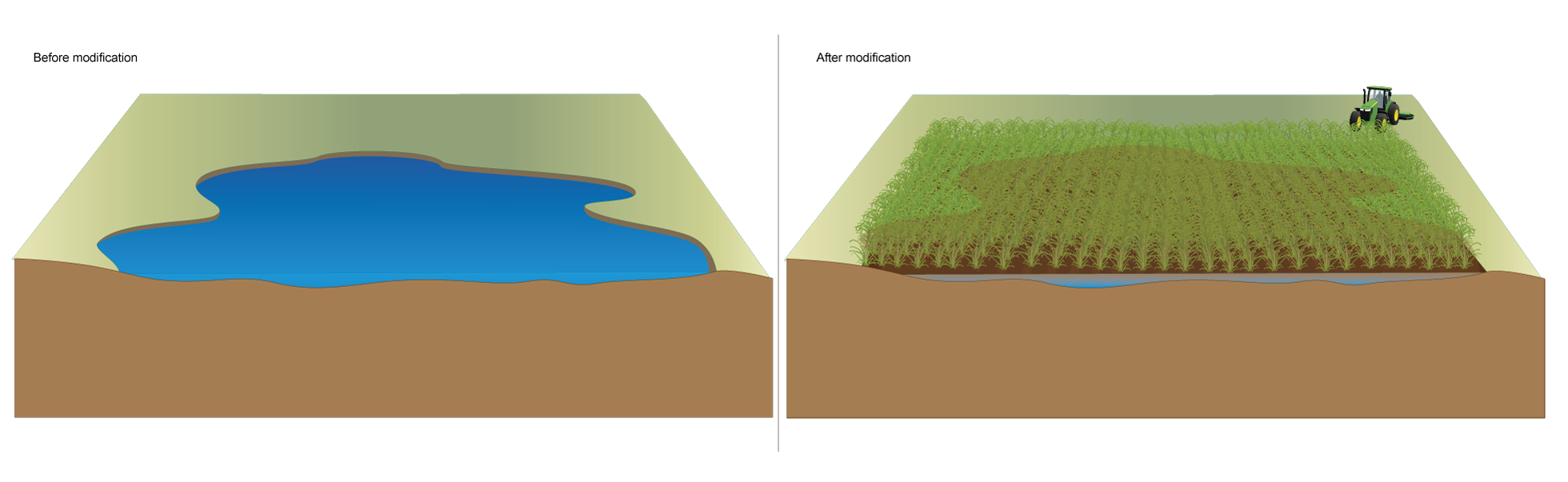 Cultivation and cropping in a wetlandCultivation and cropping can occur in a wetland usually during drier months or years when the wetland can be accessed. Cultivation and cropping activities most often result in a loss of wetland. However, sometimes wetland hydrological cycles can continue to persist despite cultivation and cropping activities which is observed with crop failure due to waterlogging. Applicable Wetland Habitat Hydrological Modification: