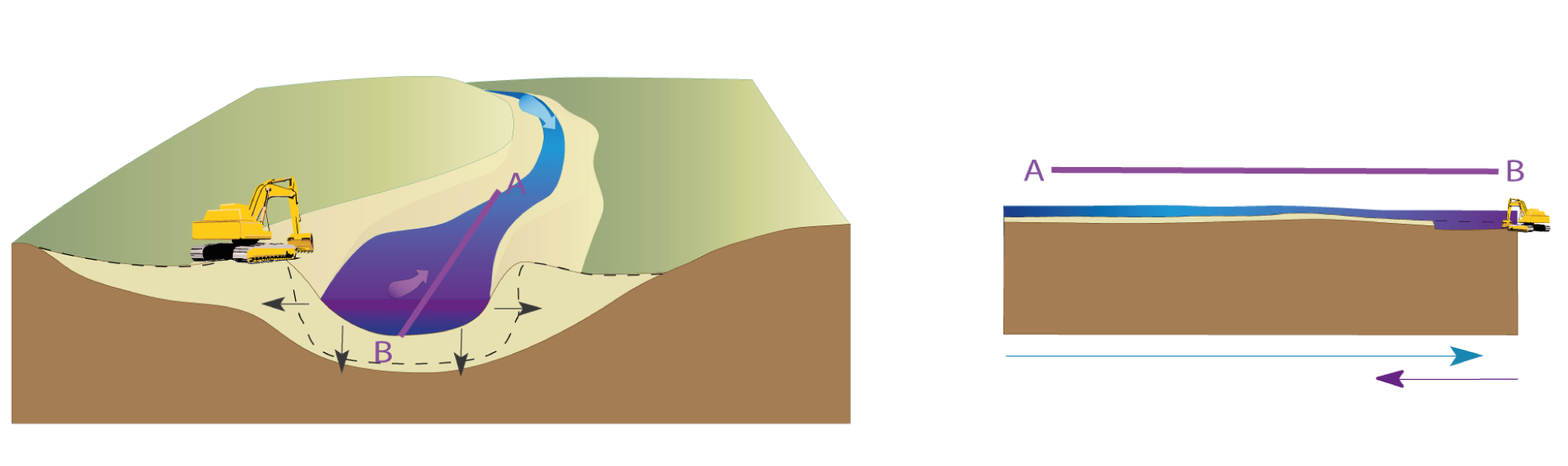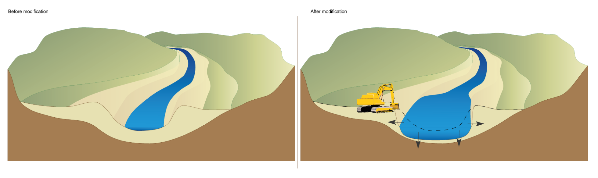 Excavation – Excavation in a channelSelect from the tabs below Excavation in a riverine channelExcavation within a riverine channel increases the extent and/or depth and may increase the persistence of water in the wetland. The wetland remains a riverine wetland system as changes in water level and extent are contained within the channel boundaries. Applicable Wetland Habitat Hydrological Modification: