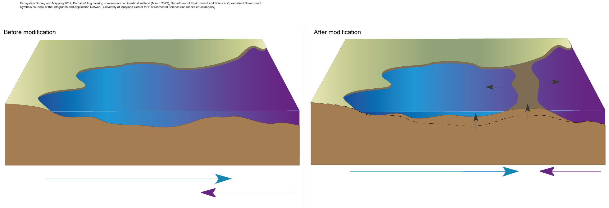 Partial infilling – Partial infilling causing conversion from an intertidal wetlandSelect from the tabs below Partial infilling of an intertidal wetland decreases the extent and/or depth of water in the wetland. Partial infilling prevents tidal inundation causing conversion to a palustrine wetland system. Complete infilling results in the loss of a wetland. Applicable Wetland Habitat Hydrological Modification: