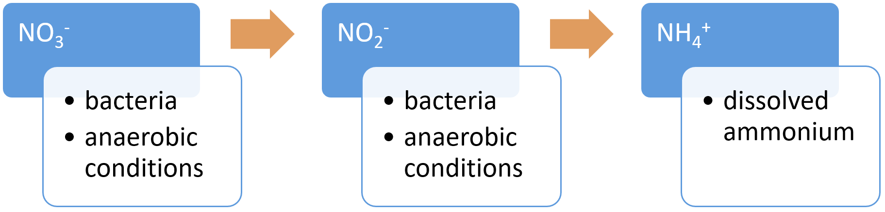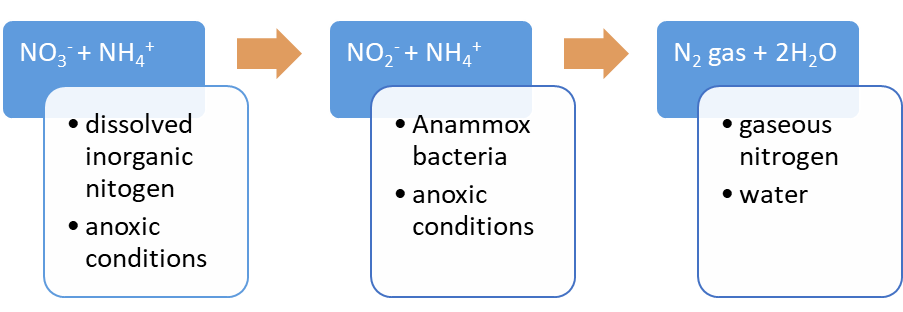 AnammoxAnammox is the process of anaerobic ammonium oxidation. This process involves the conversion of nitrate and ammonium to N2 gas by bacteria of the phylum Planctomycetes. Anammox requires anaerobic conditions, basic pH, and the presence of both ammonium and nitrite, and high carbon[11][22]. Anammox also results in the removal of nitrogen from the system in the form of nitrogen gas[4]. Biomass accumulation (vegetation uptake)Biomass accumulation, or vegetation uptake, is the build-up of nitrogen as plant material (biomass) through grass, herb, sedge, shrub, aquatic vegetation, and tree growth. Trees can accumulate and store carbon and nutrients for long time periods[2]. However, many types of wetland vegetation may return nitrogen and other nutrients to the soil when the plant dies and is rapidly decomposed, resulting in a ‘recycling’ of nitrogen. Higher nitrogen accumulation as plant biomass will occur in wetlands with warm and wet conditions. Areas of excessive weed growth may be an indication of high nitrogen accumulation[14]. DenitrificationThe denitrification process is especially active in water-logged anaerobic soils. The action of these bacteria uses nitrates and carbon for metabolism and produces free atmospheric nitrogen (N2), and other gaseous forms of N, such as nitric oxide (NO), and nitrous oxide (N2O)[19]. Export of nitrogen as N2O is likely to occur as a result of incomplete denitrification and nitrification, but generally accounts for less than 1% of nitrogen removed from denitrification[3]. In anaerobic conditions, if nitrate concentrations are high, denitrification occurs but only if hydroxides of iron and manganese are present[15], or through anaerobic methane oxidation coupled with denitrification[18]. The denitrification process is one of the key removal pathways of nitrogen by wetlands[1].
