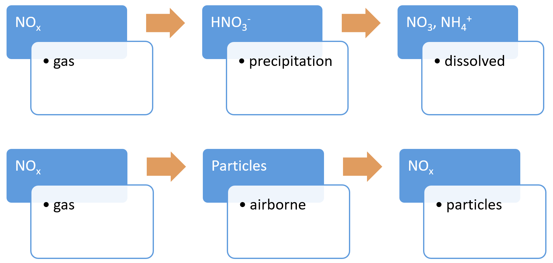 Deposition (nitrogen)Nitrogen deposition is the input of reactive nitrogen from the atmosphere to the biosphere. It can be either dry deposition (gases and dust) or wet deposition (precipitation)[17]. Increased reactive nitrogen deposition in some regions is a consequence of global emissions of oxidised forms of nitrogen (nitric oxide (NO)), nitric acid (NO3) and nitrogen dioxide (NO2) – often referred to as nitrogen oxides (NOx)) from fossil fuel combustion, and reduced N (NHx) from agricultural sources[17].