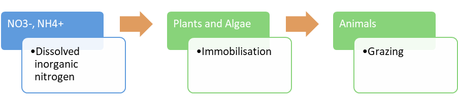 Food chain transfer (nitrogen)Nitrogen food chain transfer is the movement of nitrogen through food chains (food webs) by plants, microbes, invertebrates, fish, birds and other animals[10]. The amount that is transferred depends on factors such as the wetland type, the vegetation present, and the seasonal flooding regime. The nitrogen is processed internally through these food chains unless the animals/plants leave or enter the wetland which can result in nitrogen loss or gain to the system. Mineralisation (nitrogen) - (Decomposition/Ammonification)Nitrogen mineralisation is a two-step process comprised of a decomposition step, followed by an ammonification step. The decomposition process is the leaching of soluble compounds, physical fractionation, microbial conditioning (fungi and bacteria colonise leaf litter which alters the leaf substrate, and increases palatability), and feeding by invertebrates[12]. This can occur in the sediment (benthos) or as organic matter that is transported downstream. The rate at which organic N is processed depends on the chemical and physical properties of the organic N, the biota and environmental factors (e.g. temperature, oxygen, and other nutrients). The ammonification process is any chemical reaction in which NH2 groups (part of amino acids) are converted into ammonia or its ionic form, ammonium (NH4+), as a product[12].
