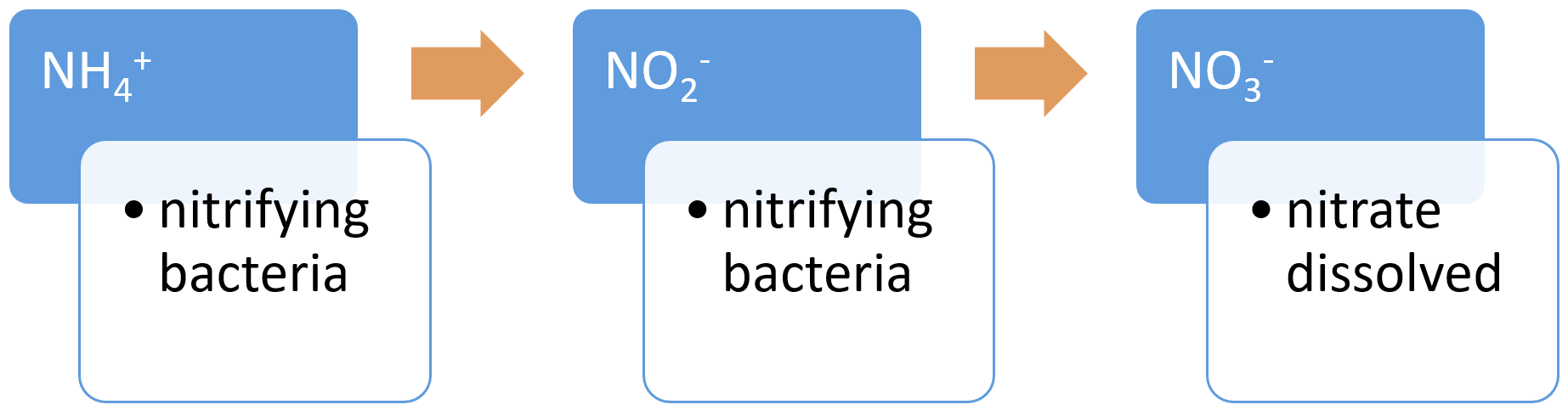NitrificationNitrification is the biological oxidation of ammonium to nitrate under aerobic conditions[19]. It occurs in two forms: autotrophic nitrification and heterotrophic nitrification. Autotrophic nitrification, a process carried out by nitrifying bacteria, transforms ammonium (NH4+) in water and soil into nitrates (NO3−), which plants can incorporate into their tissue or biomass. Nitrification requires the presence of ammonium ions (NH4+), nitrifying bacteria (Nitrobacter and Nitrospira), a carbon source, oxygen availability, neutral pH, and temperatures between 20-30°C[20]. Heterotrophic nitrification is the transformation of organic N into nitrates (NO3−) by microorganisms, and occurs in acidic soils (pH less than 6)[23].