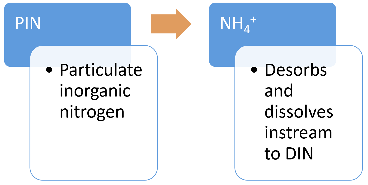 Desorption of particulate inorganic nitrogenDesorption of PIN (particulate inorganic nitrogen) is a physico-chemical process in which the ammonium (NH4+-N) adsorbed to the negatively charged silt and clay particles in sediment is desorbed (becomes soluble) through cation exchange processes (e.g. exchange of ammonium with sodium or magnesium) in water[7]. This often occurs when terrestrial sediment enters saline water in estuaries.