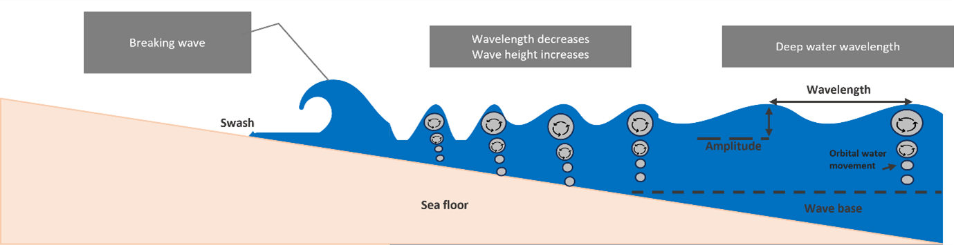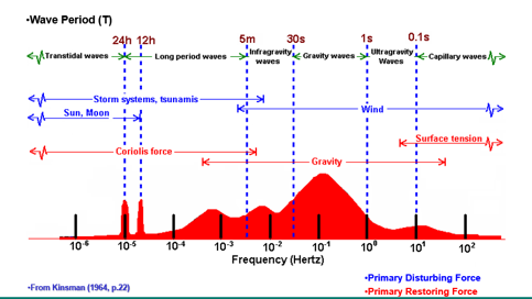 Wave action is an important influencer of freshwater, estuarine and marine wetland geomorphology. Wave energy magnitude underpins the typology of estuaries, along with tidal range and riverine discharge[4]. Longshore drift is a coastal process driven by waves that transport sediment parallel to the shoreline through the zigzag of wave swash and backwash, such as the longshore drift transport of a ‘sand river’ of sediment from the Victorian border to K’gari. On high wave energy sandy beaches, sand is deposited all the way from offshore to the dunes. Low wave energy beaches are typically muddy to mixed sediment below mean sea level (MSL) and sand above MSL. Both silty and sandy beaches have intertidal sand waves that form ridges, troughs and offshore bars[15]. Wave-dominated estuaries are prominant along the south-west and south-east coasts of Australia, including along the Queensland coast from K’gari (Fraser Island) southward. For estuaries or lakes connected to the shoreline, ocean waves and tides push sand bars from offshore into the entrance, and gradually close the entrance channel and may even accrete to form sand dunes. Accretion of sand bars may periodically form a tidal barrier to cut off tidal influence – forming a type of wave-dominated estuary termed an ‘Intermittently closed and open lagoon lakes’ or ICOLL[9][10][4]. Ocean waves can be used as a renewable energy source and its parameters are mappable – see ARENA the National Wave Energy Atlas. Larger inland lakes, such as Lake Wyara and Lake Numalla, are also affected by wind induced waves that influence the shoreline geomorphology of the lake[6]. Wave movement in lakes affects water quality by influencing factors such as sediment resuspension, dissolved oxygen concentration and water clarity[8][20][12]. As a result of wind driven waves and mixing, some lakes will have high turbidity levels that lead to a narrow littoral zone for primary production. Wave, wind and/or tidally-induced water movement promotes circulation, mixing and oxygenation of surface layers of wetland water bodies. The well-mixed surface layer is influenced by wind and wave action, while beneath it there may be a distinct layer with different salinity, temperature, nutrients and oxygen content. Enclosed water bodies may become stratified during low rainfall periods. Wind-forces and wind-driven wave action may modify circulation and turbulent mixing, impacting on the degree of stratification in a waterbody. Shallow open estuaries receive more wind-waves than narrow, deep estuaries. Other estuarine mixing processes may be driven by the balance between denser, saltier oceanic tidal water and freshwater flows (see Tides). Waves due to storm tides and surges can also interact with freshwater flow events to modify salinity mixing processes in the estuary[4]. As well as sandy beaches, wave energy is a strong shaper of intertidal and shallow subtidal ecosystems and their biota. This includes distinct assemblages on rocky shores and coral reefs, such as intertidal filter-feeders of the surf zone (see Intertidal high energy over consolidated substrate) and corresponding subtidal gravel, mud and sand ecosystems. The growth forms of coral on clear water offshore coral reefs respond to different wave energies. Wave energy magnitude (significant wave height) can be used to predict the distribution of coral types[13], in combination with other factors. Characteristics of wavesWaves are characterised by their height (vertical distance between the wave crest and trough), period (time for a wave to pass), wavelength (horizontal distance between successive wave crests), speed or celerity (rate of travel) and frequency, (i.e. the number of waves passing through a given point in time). Water wave periods vary with the disturbing energy force causing the wave action (e.g. wind, storm systems and tsunamis) and the energy source restoring the water to equilibrium (see Fig. 1 after Kinsman, 1964, p.22)[7]. Tides also propagate via water waves but differ in their behaviour from wind waves – see tidal range. Figure 1 - Wave periods vary according to the primary disturbing forces (blue, e.g. wind, storm systems and tsunamis) and those that restore equilibrium (red – e.g. surface tension, gravity and the rotational force of the earth Coriolis force). After Kinsman 1984[7]. In the ocean, waves can be classified as either sea waves (generated by the local winds) or swell (generated over a long distance by significant weather systems). Waves vary in height, and significant wave height is a convention used to measure wave height statistically (an average of the largest one-third of waves). The maximum wave height can be as much as twice the significant wave height. In some cases, waves of different wavelengths can combine as one wave overtakes another, adding their wave heights together. The motion of water particles in a wave is in a vertical circular orbit, that is, water particles do not move horizontally when in deep water[1][3][18]. With increasing depth, the orbit diameter decreases until there is no wave action when the depth exceeds four times the wavelength (wave base). In nearshore waters, the wave base (i.e. the smallest orbiting water particle) encounters the sea floor (known as the Depth of Closure). As the water shallows, the orbiting particles at the wave base encounter sea floor friction and travel slower than the orbiting particles at the surface. Wave set-up is the process of shoaling that causes the waves to decrease in speed and wavelength and the wave height to increase and tip forward so that it breaks. The breaking wave surges up the beach (wave run-up). Figure 2 - A wave approaching the shore undergoes significant changes as the water in orbital motion encounters the seafloor. As waves encounter the substrate/sea floor they create strong currents capable of entraining and transporting sediment. When waves encounter a consolidated object such as a