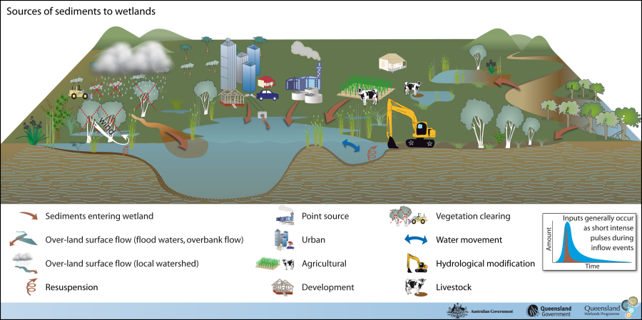 Sediments enter wetlands from diffuse catchment via overland surface flow (local watershed) or in flood waters (overbank flow) or directly from urban and agricultural land use or point sources.