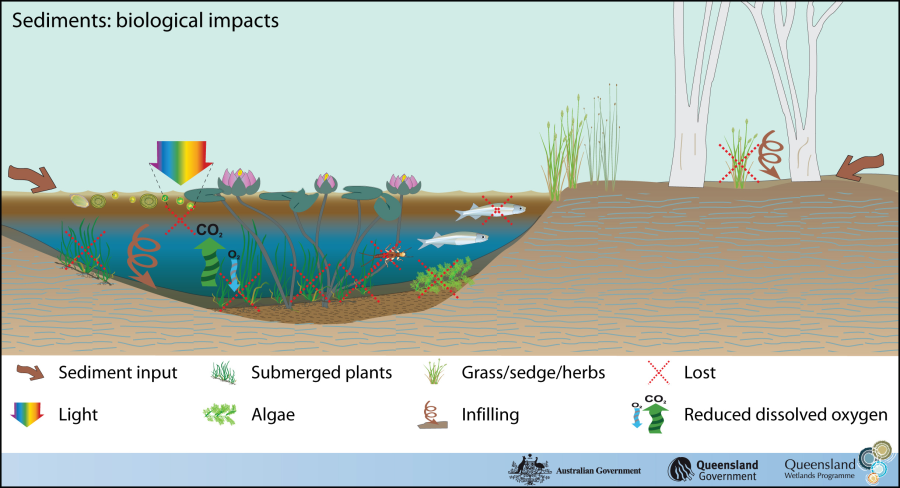 Sediment rich water entering a wetland may result in a loss of sensitive species and a change in primary production and community structure. A decrease in light penetration will decrease photosynthesis and cause a loss of submerged plants and/or algae. This large pool of organic matter to be decomposed can greatly reduce dissolved oxygen levels. The effects of increased sediment loads such as smothering, clogging of gills or loss of visibility (for catching prey) can kill sensitive fauna such as fish or macroinvertebrates. Sediment loads can infill wetlands, altering the wet/dry periodicity and result in a change from more aquatic species, such as grass/sedge/herbs to more terrestrial species, such as trees.