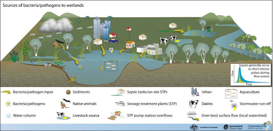 Mammal derived bacteria/pathogens are sourced from urban areas, septic tanks/on-site STPs, stormwater run-off, sewage treatment plants (STPs), STP pump station overflows or from the local (watershed) catchment.