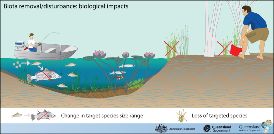 The removal of biota can have a variety of impacts on the ecosystem including: