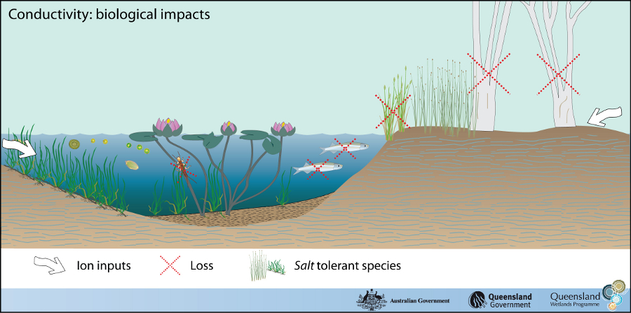 Ion rich water entering a wetland may results in a loss of sensitive species and a change in community structure with more salt tolerant species dominating.